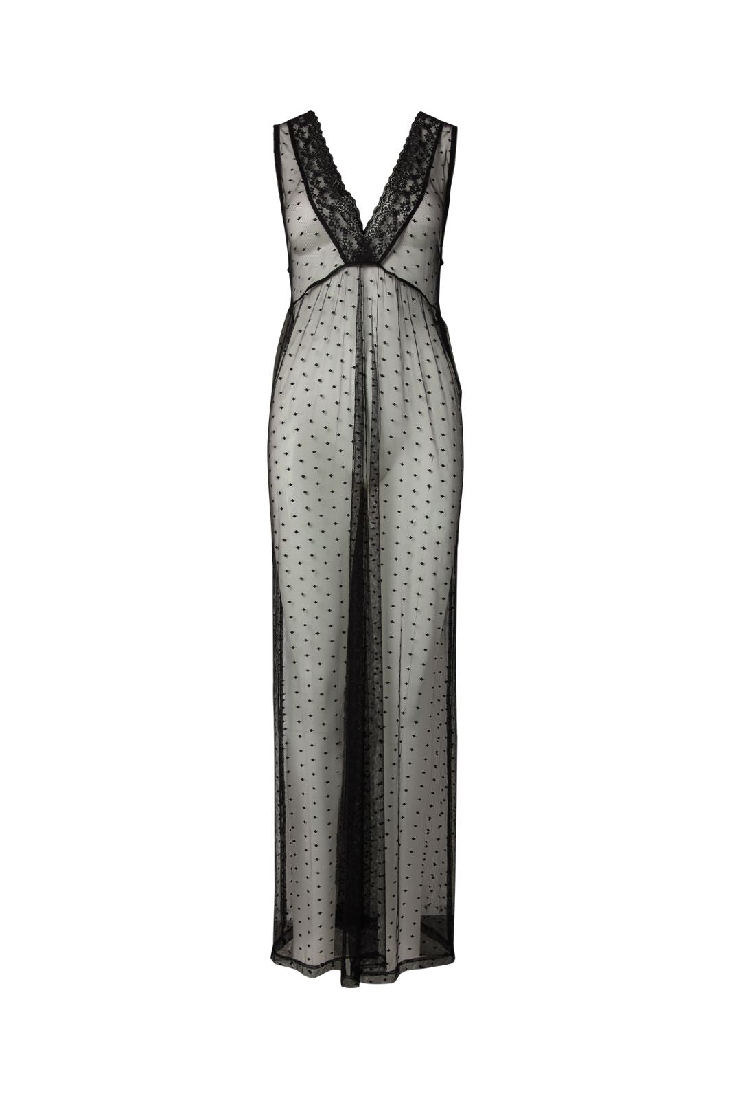 Sort kjole fra Pieces med blonder og prikker. Kjolen har en dyb V-udskæring og er ærmeløs med en ankel-lang længde.