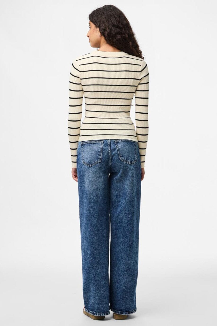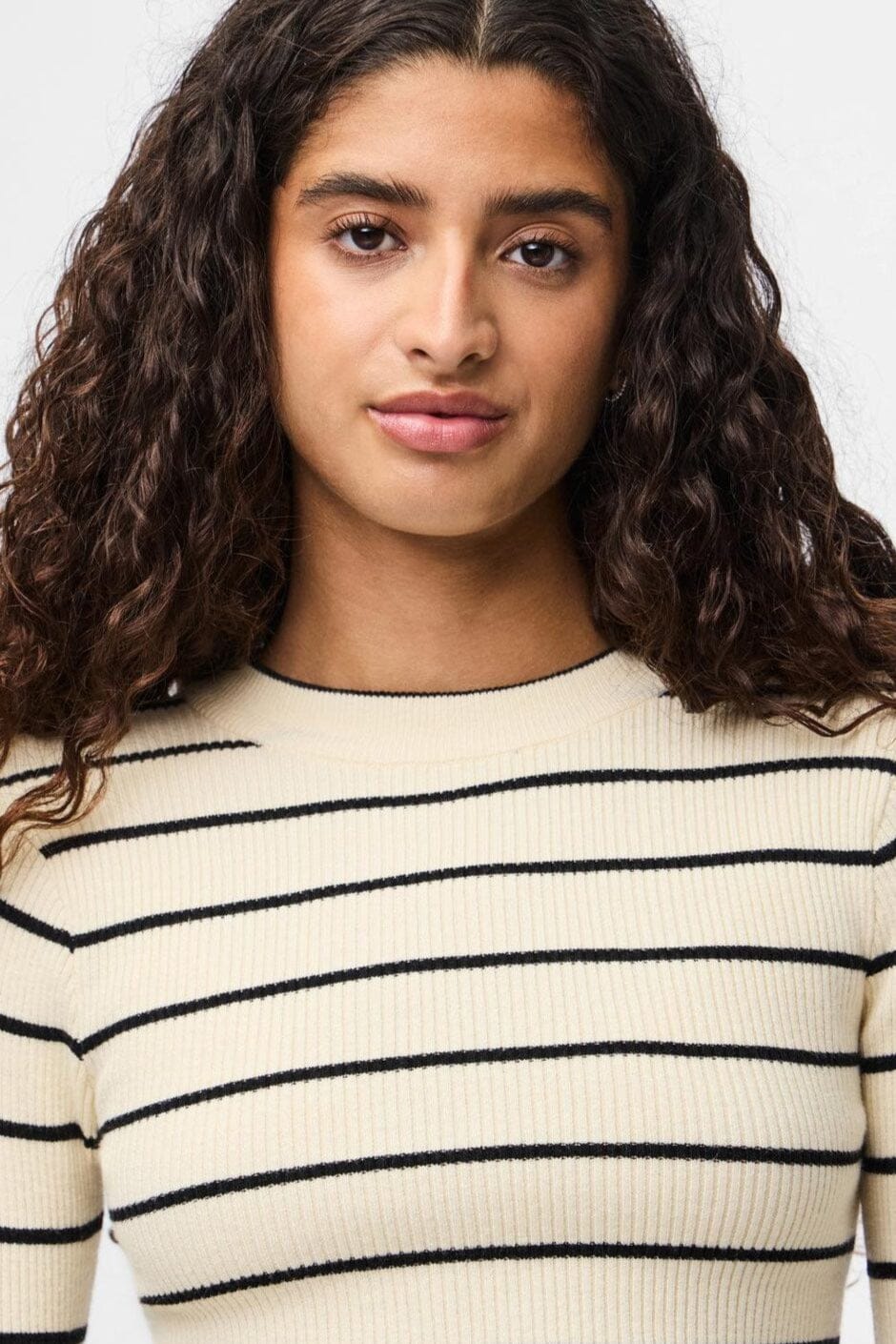 Stribet striktrøje fra Pieces med rund hals. Den lyse birkefarve har smalle sorte striber, og strikken har en tætsiddende pasform med ribbet tekstur.