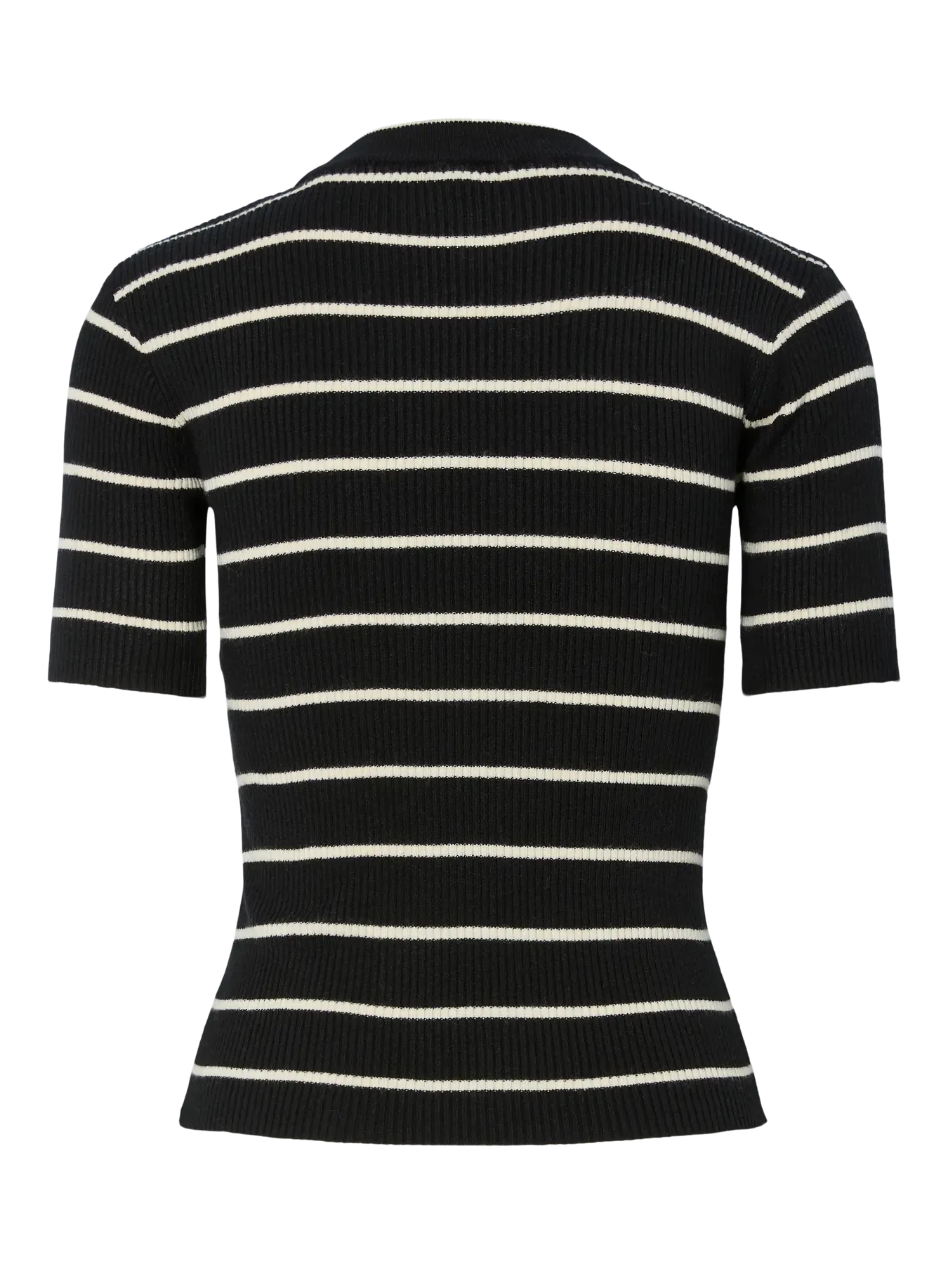 Strikket top fra Pieces med sorte og lyse striber. Toppen har korte ærmer og en rund halsudskæring.