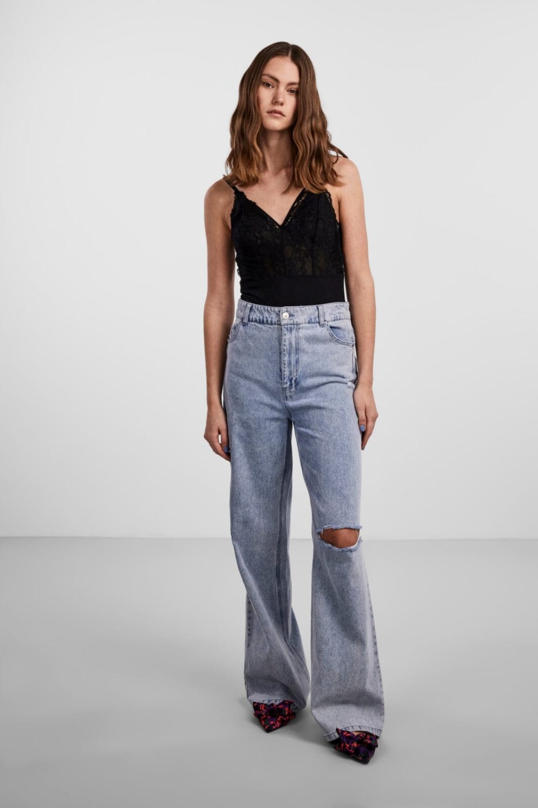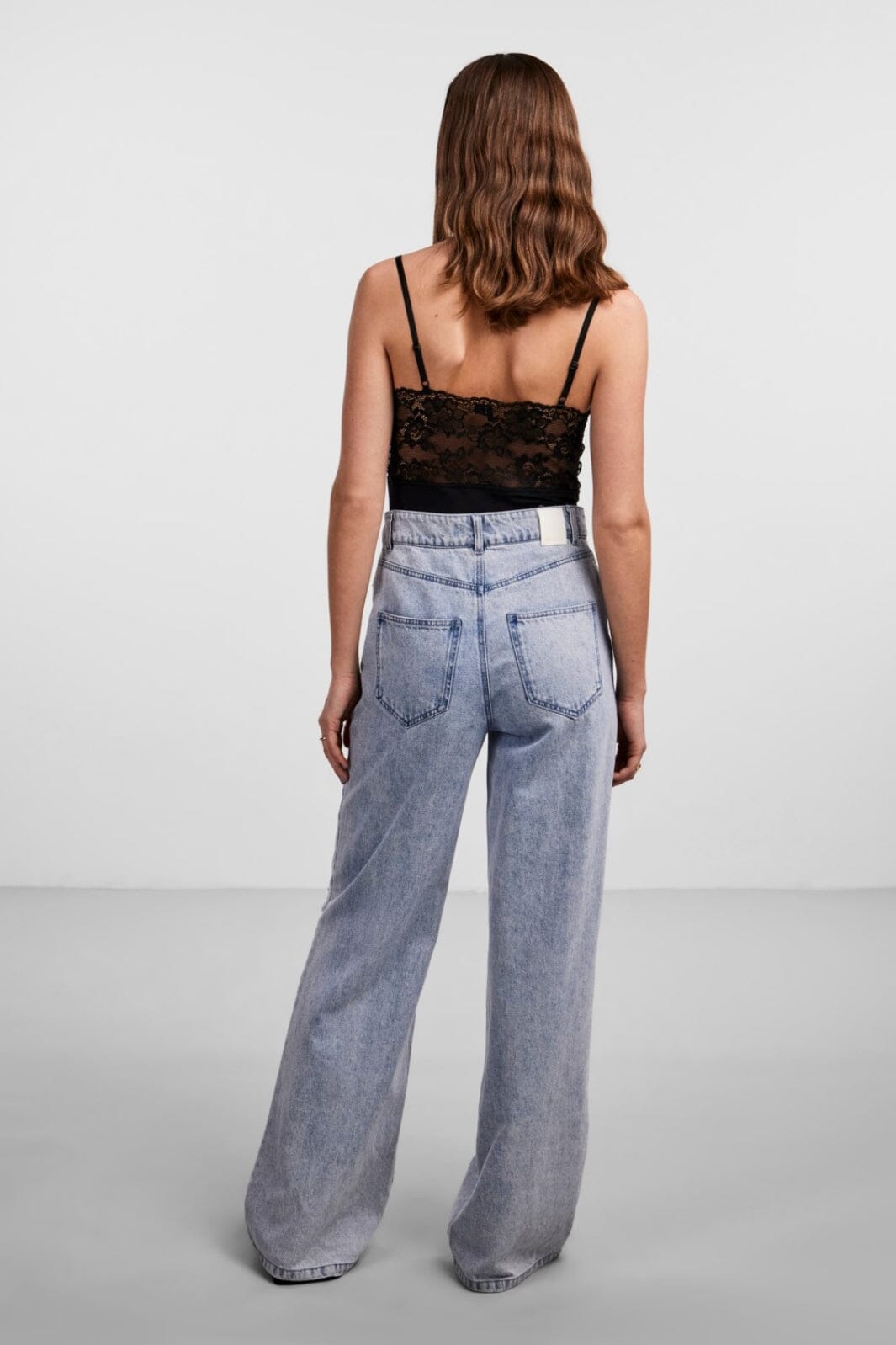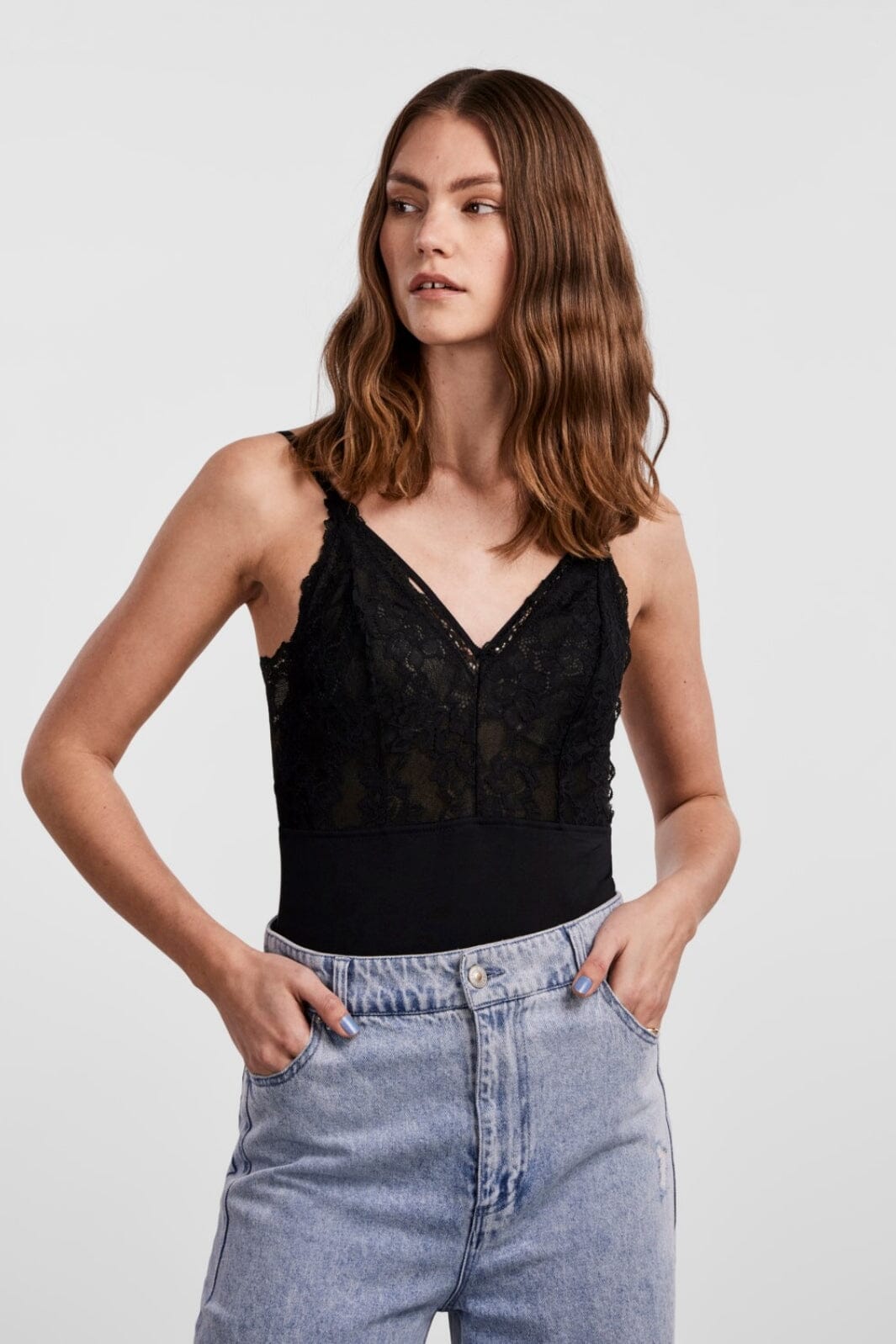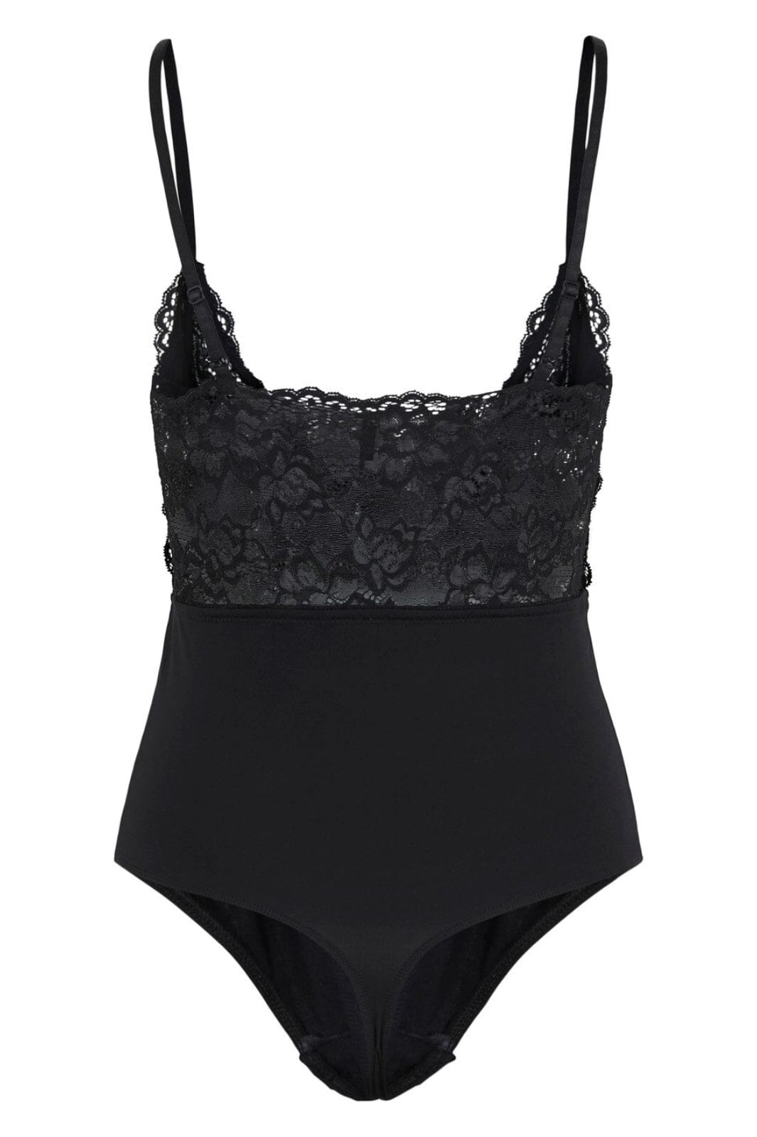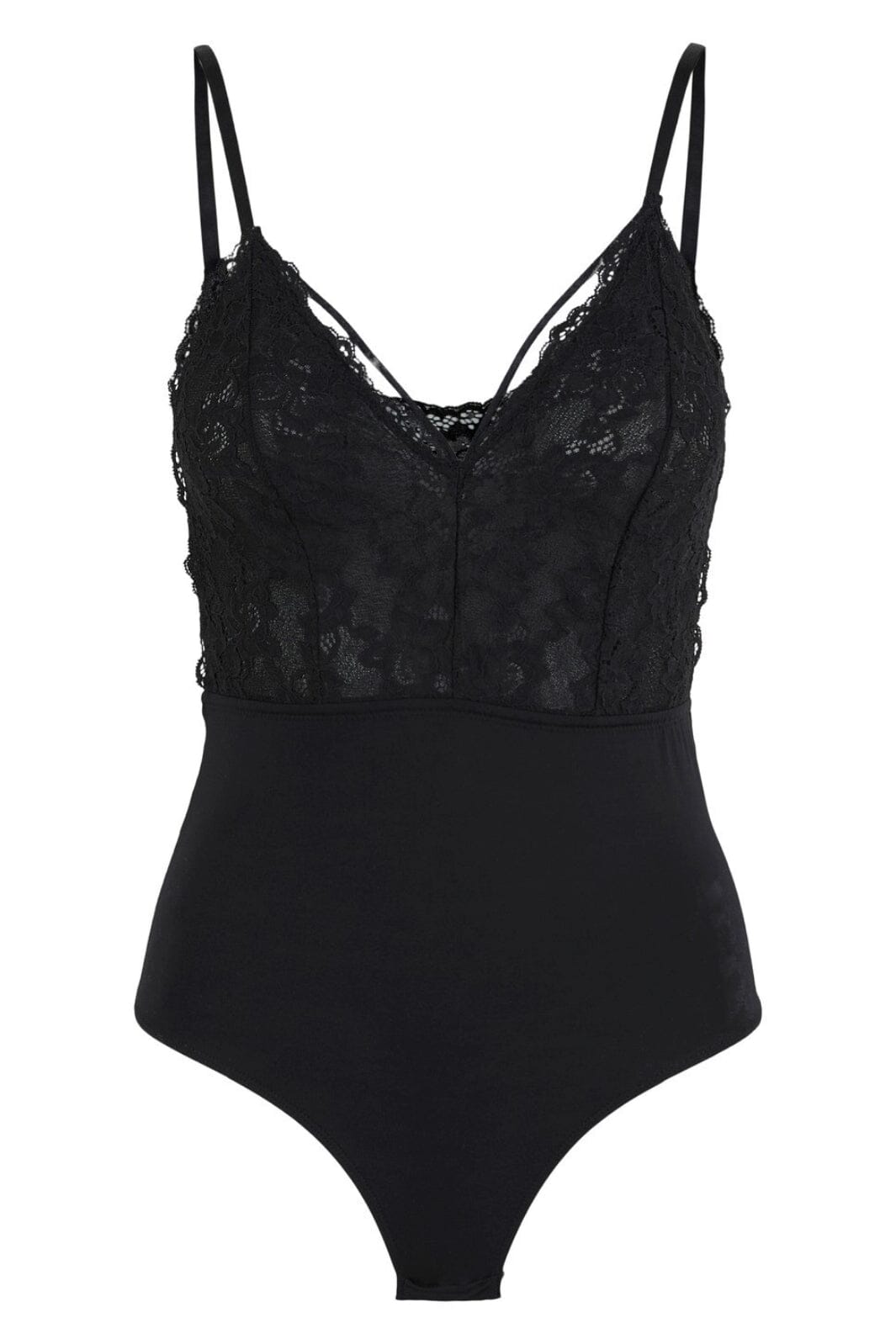 Sort bodystocking fra Pieces med blondedetaljer i overdelen. Designet med tynde spaghettistropper og V-halsudskæring. Den hoftekorte længde gør den let at style med forskellige bunde.