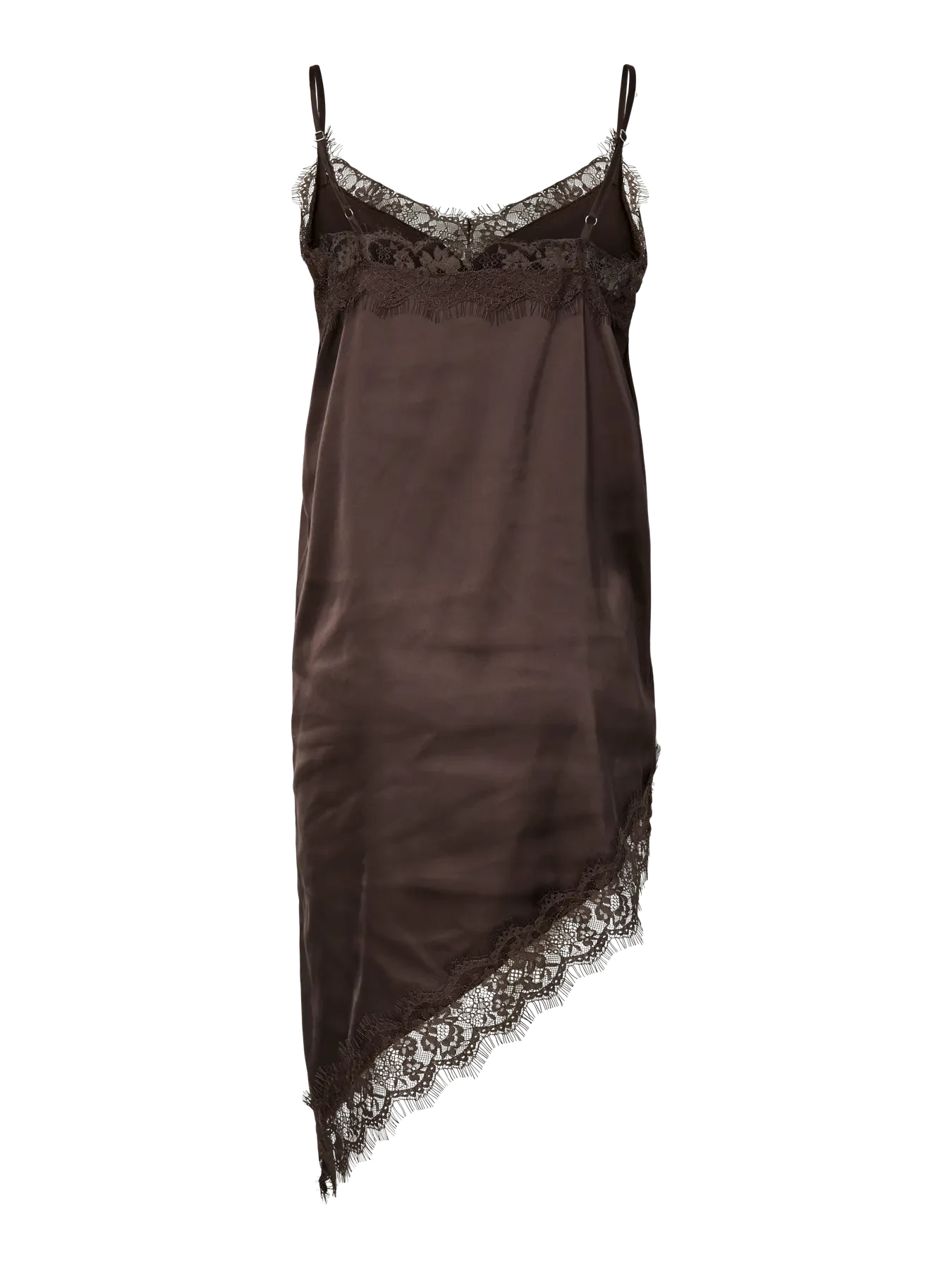 Brun satinkjole fra Pieces med blondedetaljer og spaghetti-stropper. Kjolen har en V-hals og en asymmetrisk kant forneden.