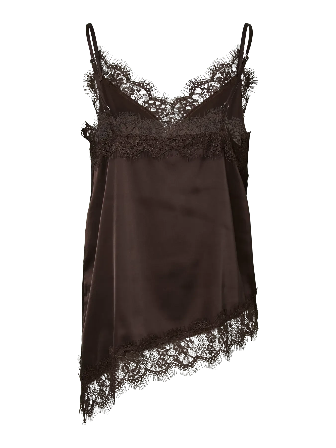 Brun satintop fra Pieces med blondedetaljer. Toppen har justerbare spaghettistropper og en asymmetrisk kant, der giver den et feminint udtryk.