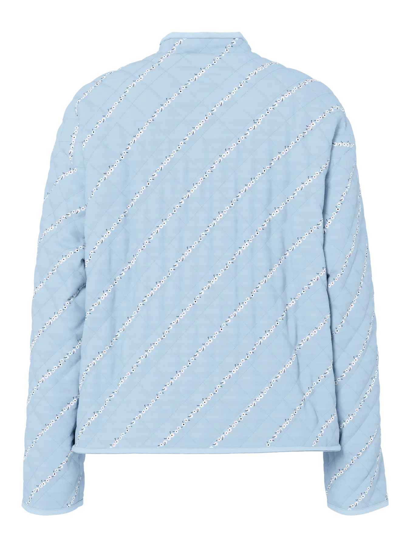 Quiltet jakke fra Pieces i lyseblå nuance med et mønster af blomster, striber og tern. Jakken er lavet af 100 % viskose.