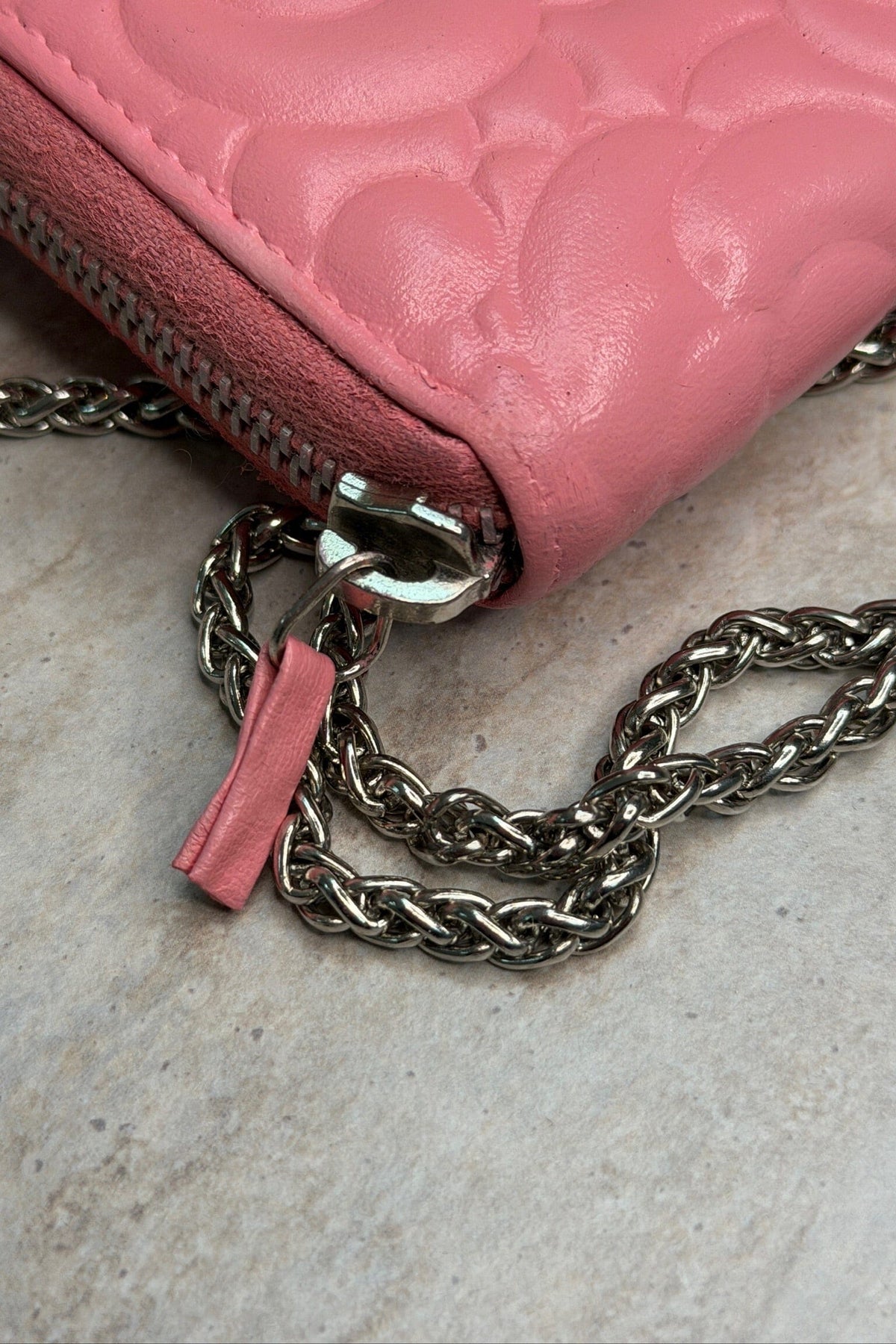 Pink pung fra Chanel med blomstermønster og kæderem. Produktet er fra Preloved Vintageline x Molly&My og er i god, men brugt stand.