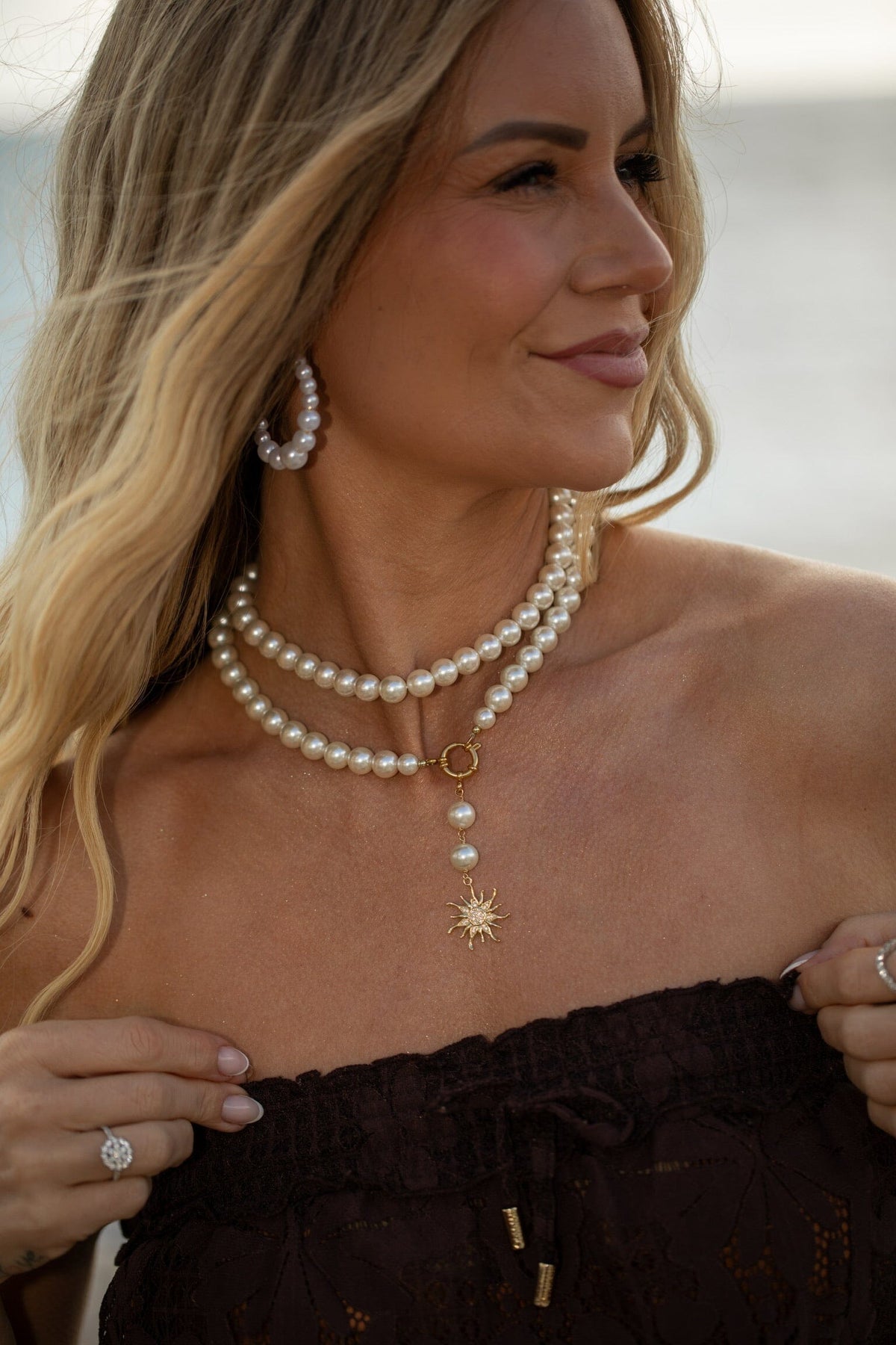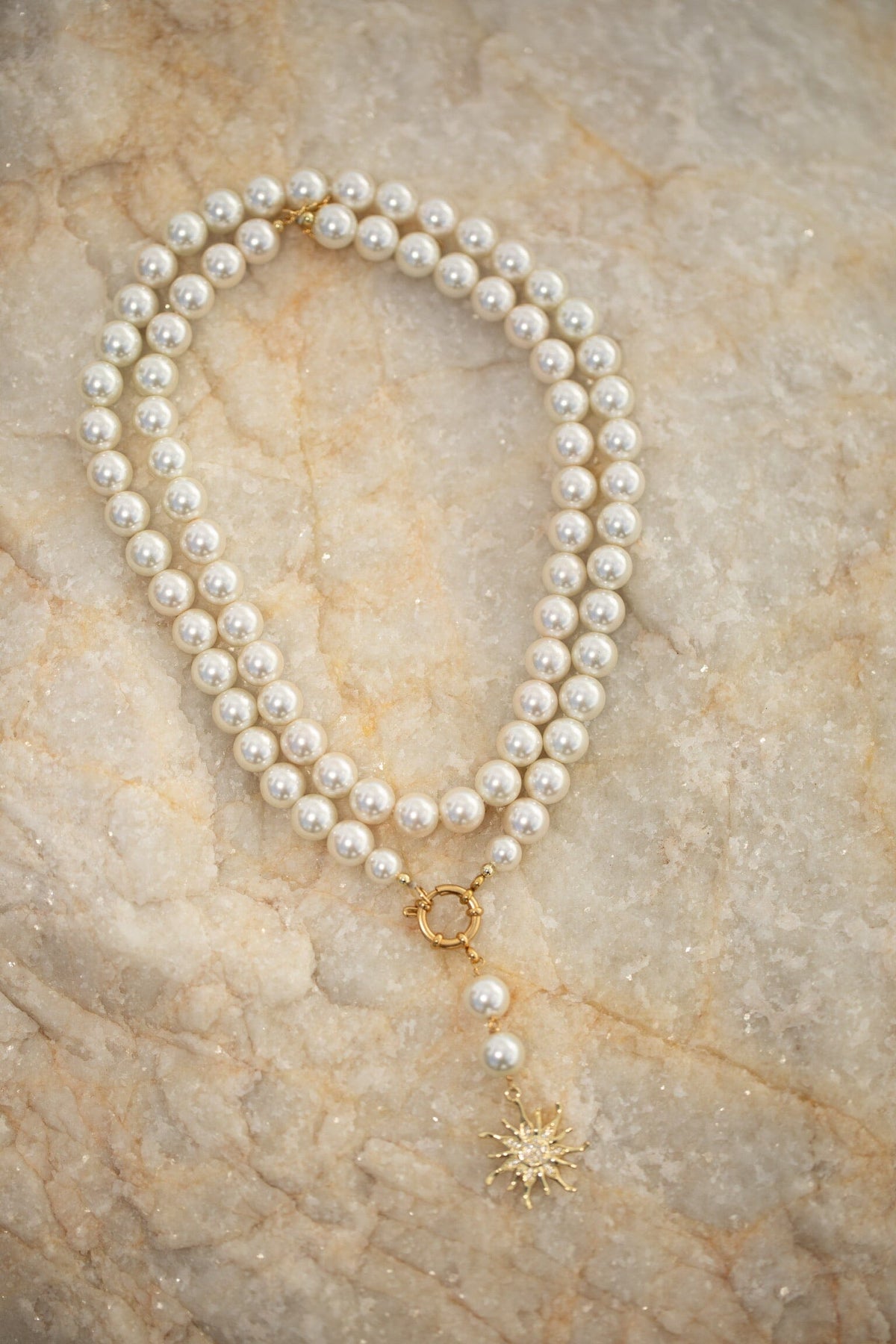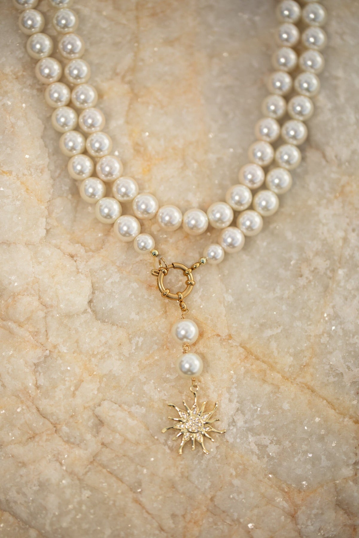Chokerhalskæde fra Rooted med to rækker af perler og skaller samt et solformet vedhæng. Halskæden er forgyldt og har en guldspænde.