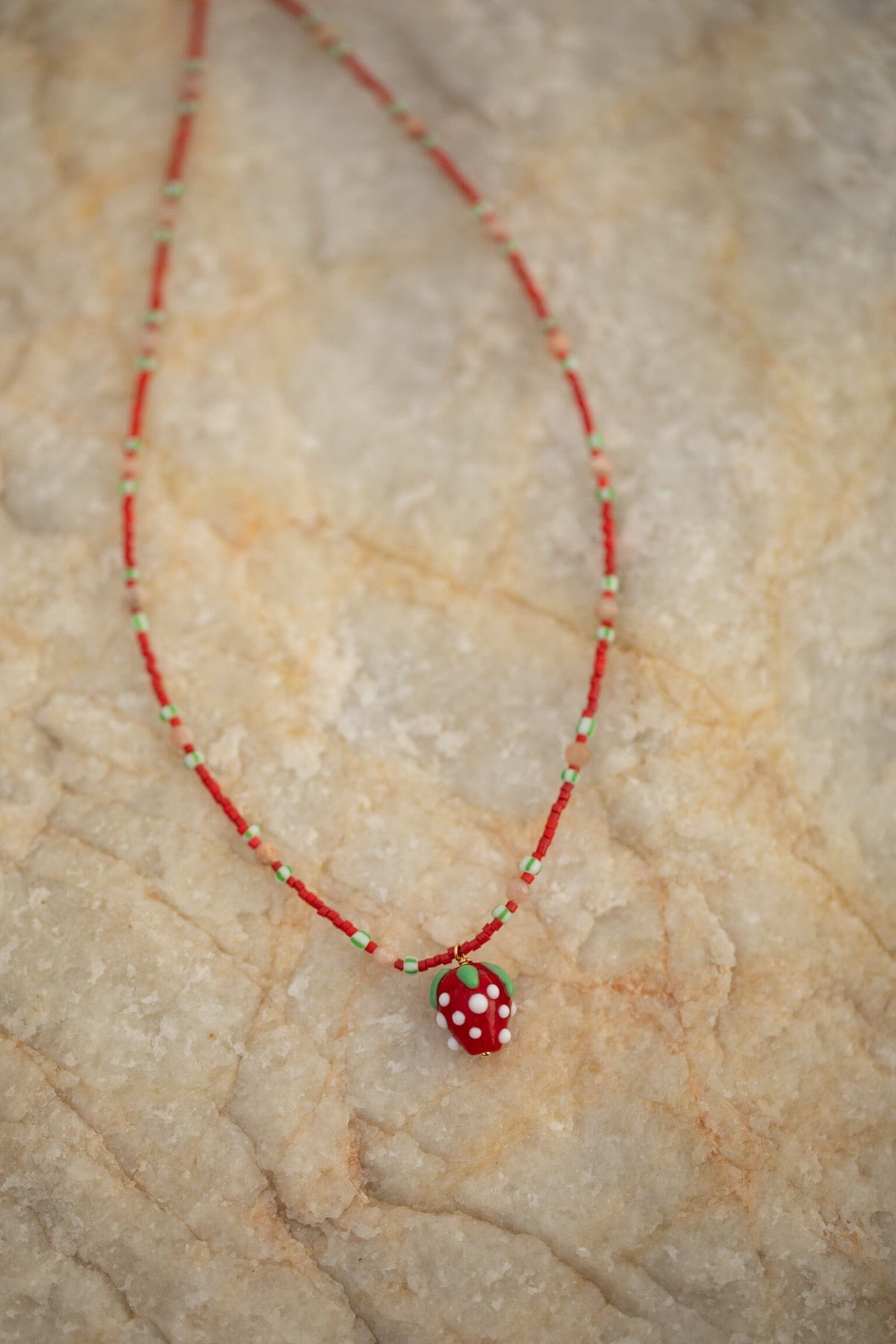 Halskæde fra Rooted med en rød base og små perler i forskellige farver. Halskæden er lavet af forgyldt materiale.