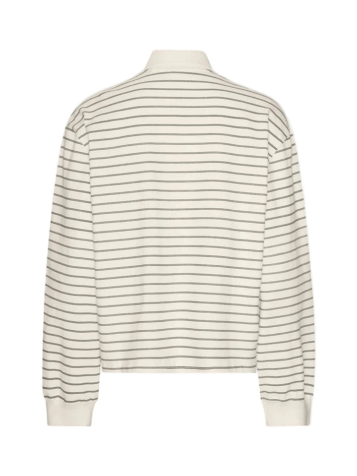 Langærmet polo fra Rotate i creme og hvid. Den stribede trøje har en oversized pasform med klassisk polokrave og knaplukning foran.