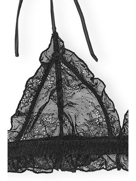 Sort trekantet bralette fra Rotate med blonde, flæser og sløjfer. Braletten har et uforet design med trekantede skåle dækket af blonde.