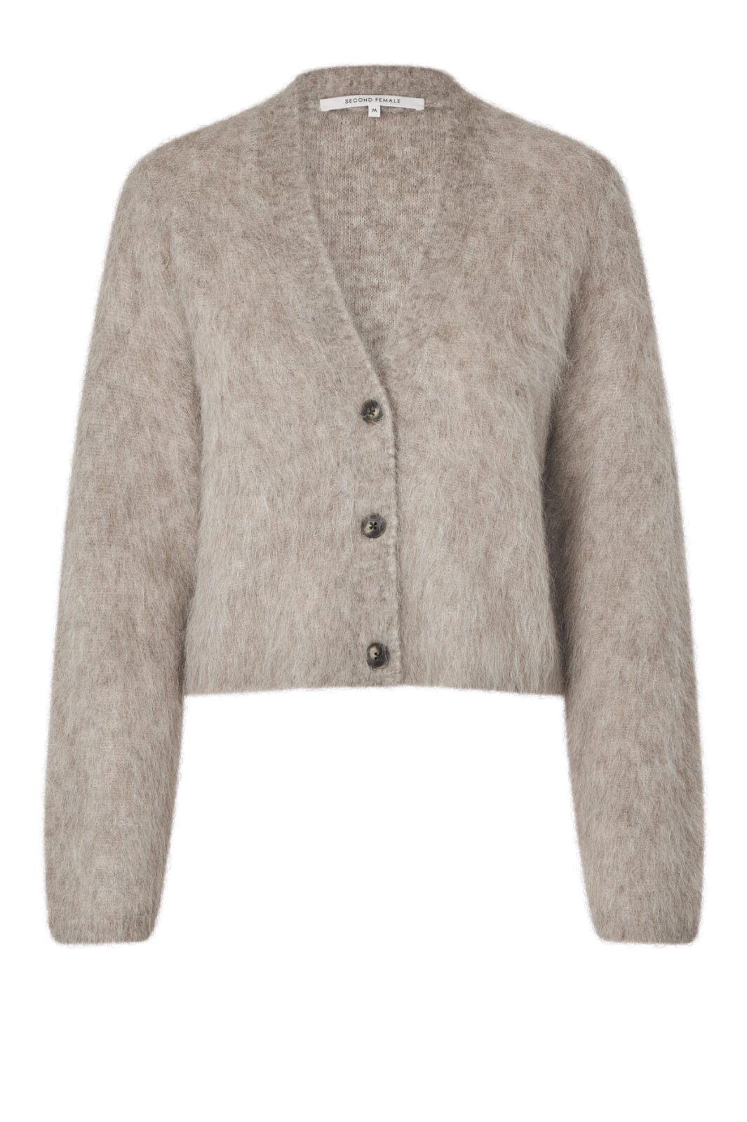 En strikket cardigan fra Second Female i en lys brun farve. Cardiganen har en blød, fluffy tekstur og en afslappet pasform.