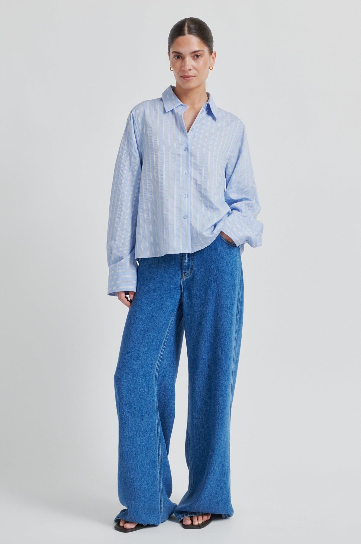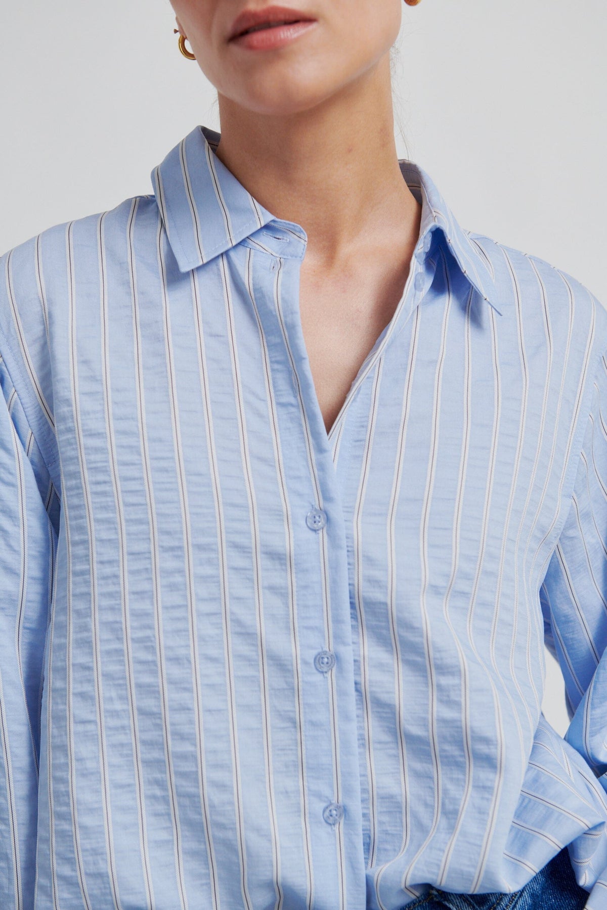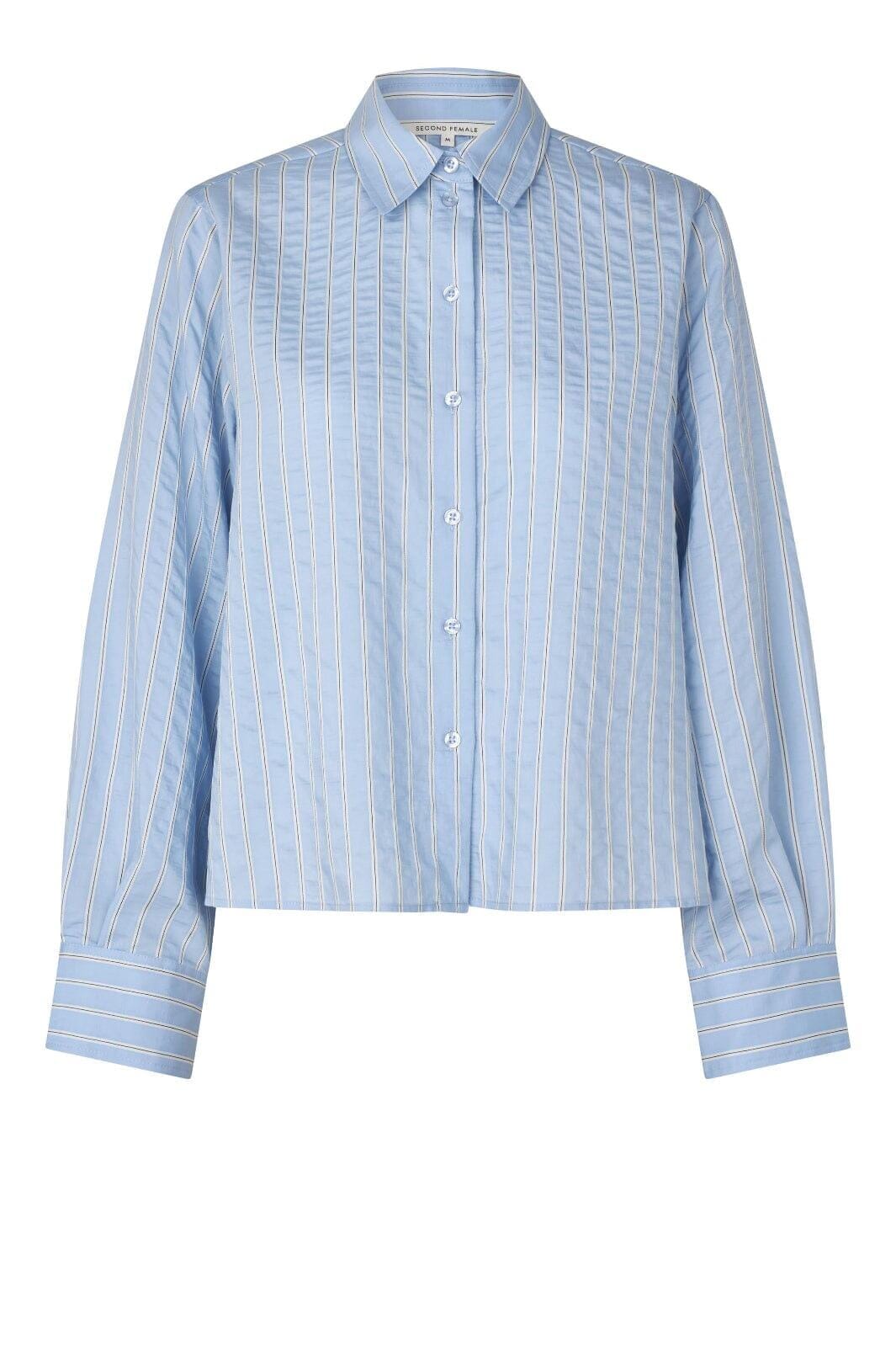 Lyseblå skjorte med hvide striber fra Second Female. Skjorten er lavet af en blød blanding med 72% viskose, og den har en kort og bred pasform.