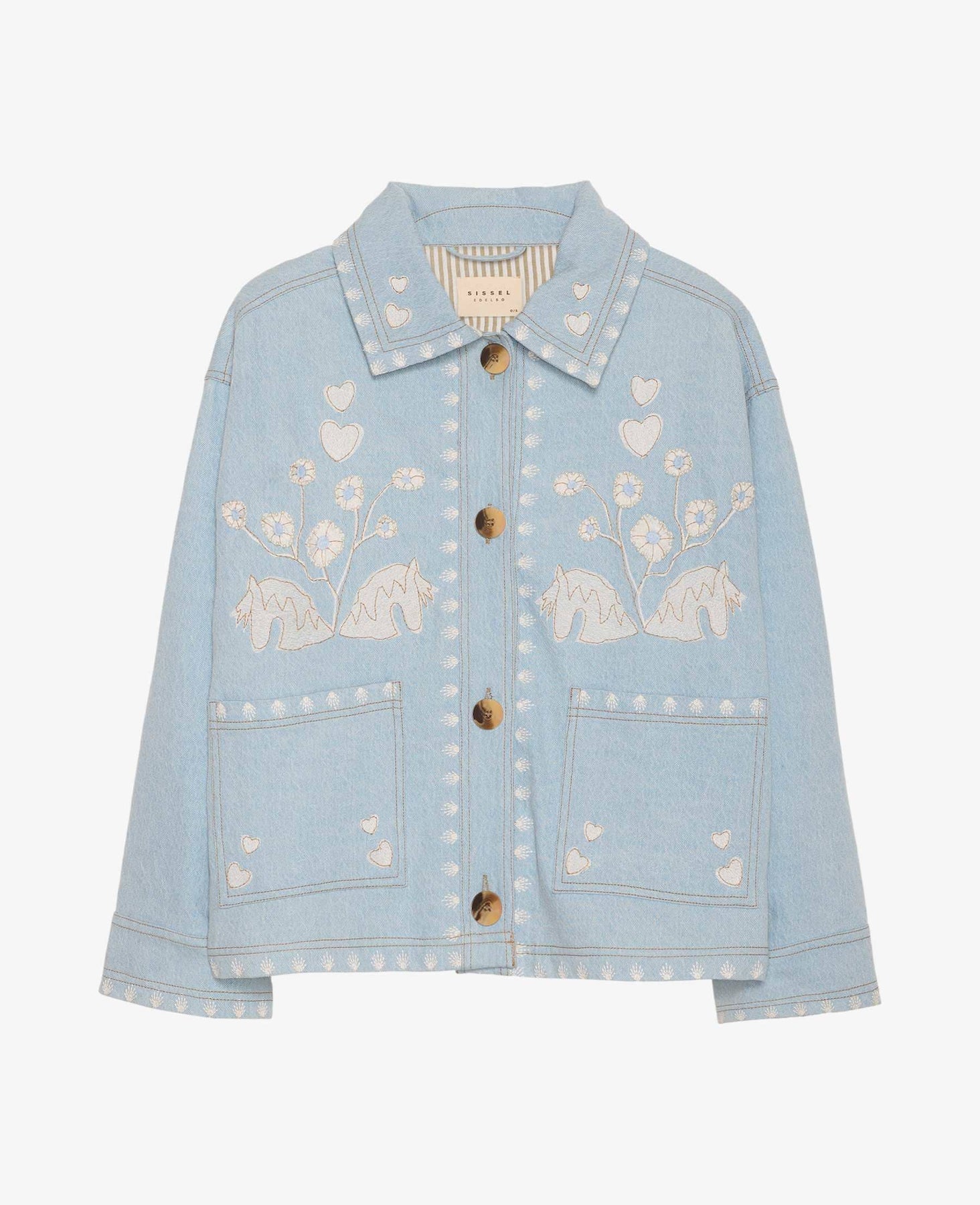 Denimjakke fra Sissel Edelbo, lavet af overskydende denim i lys blå nuance. Jakken har oversized pasform, formede ærmer og en stor krave med knaplukning.