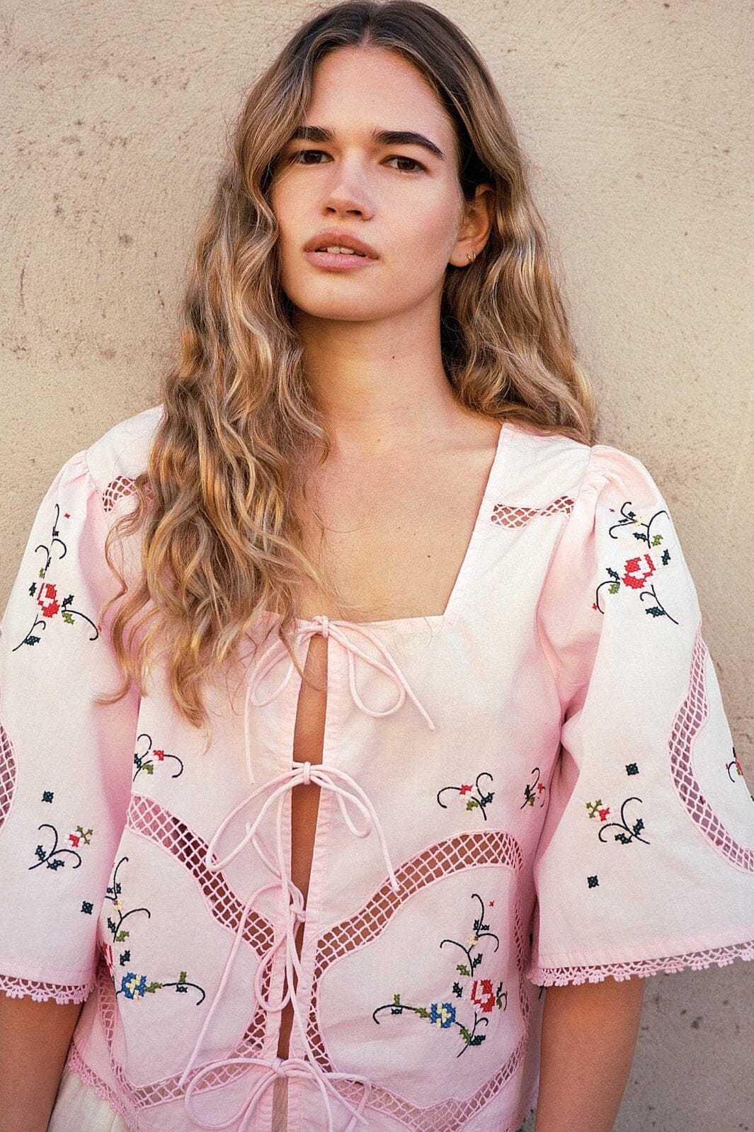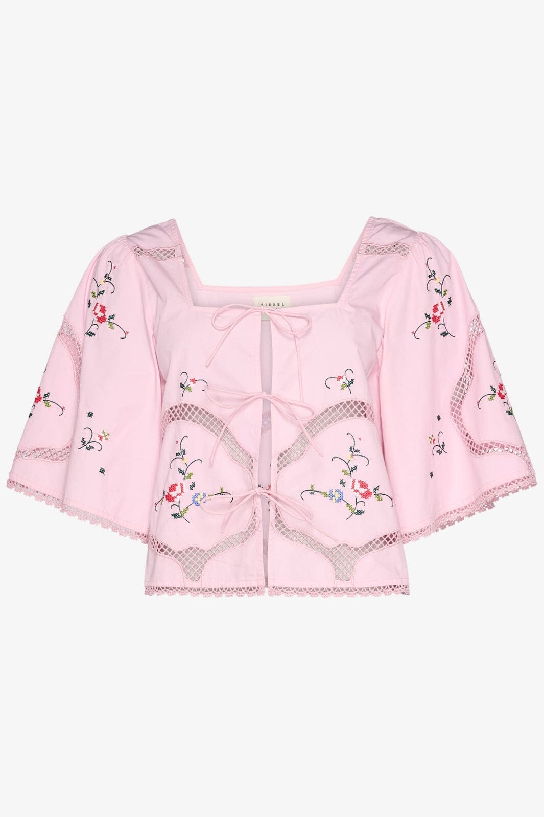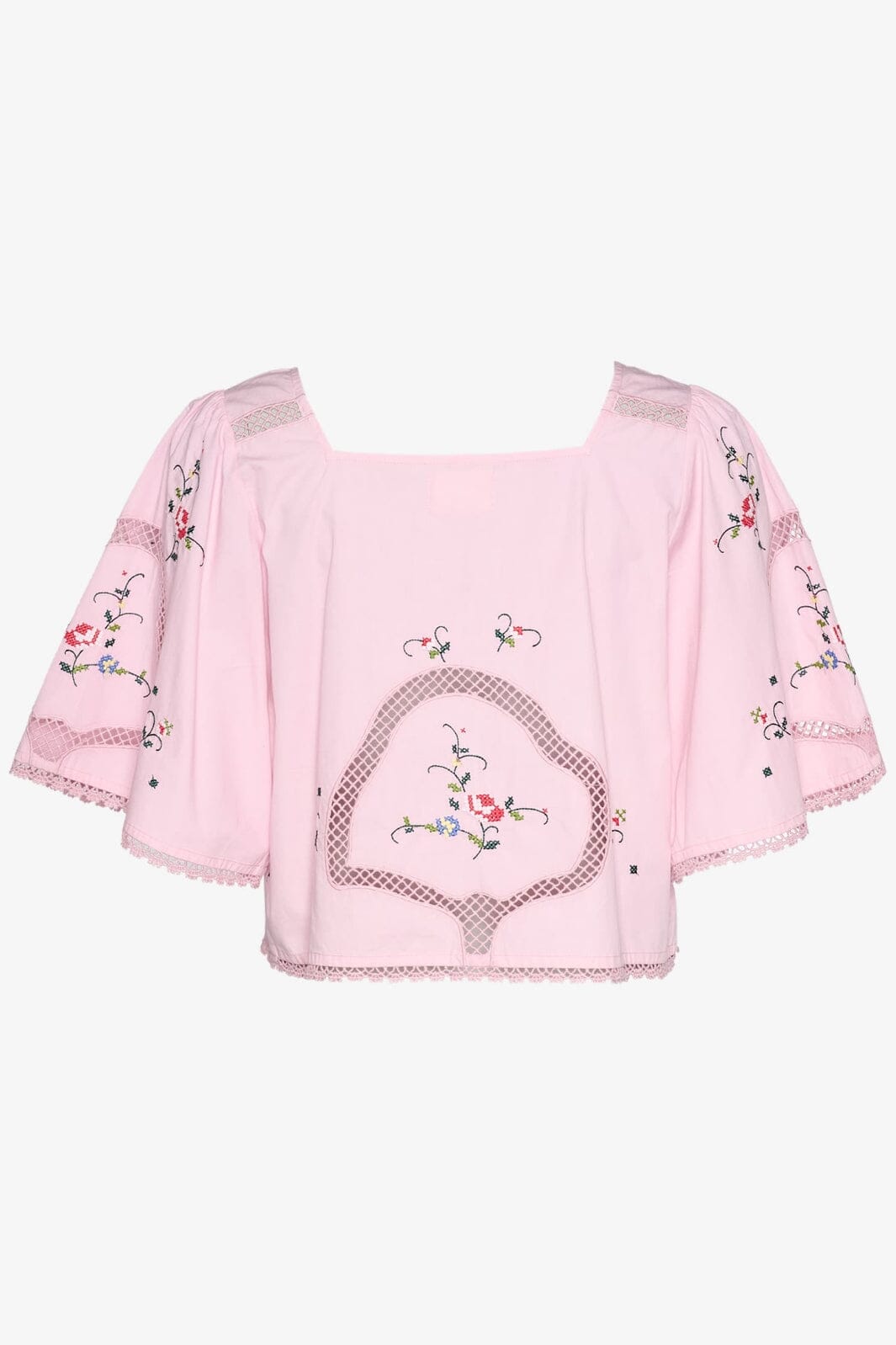 Top fra Sissel Edelbo i lyserød økologisk bomuld. Toppen har en firkantet halsudskæring med snørelukning foran. De brede ærmer har rynkede detaljer ved skuldrene og går til albuerne.