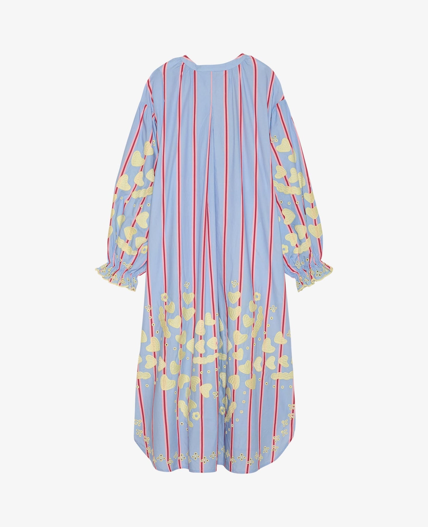 Kjole fra Sissel Edelbo med lyseblå baggrund og røde vertikale striber. Kjolen har broderede lysegrønne hjerter og blomster på forsiden, ærmerne og den nederste del.