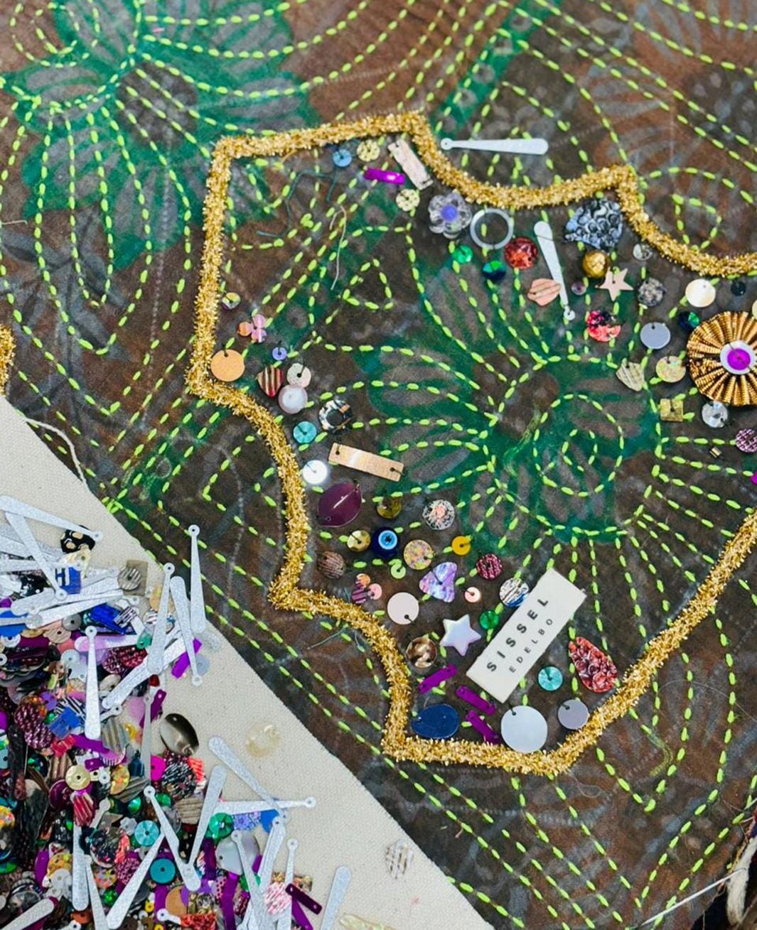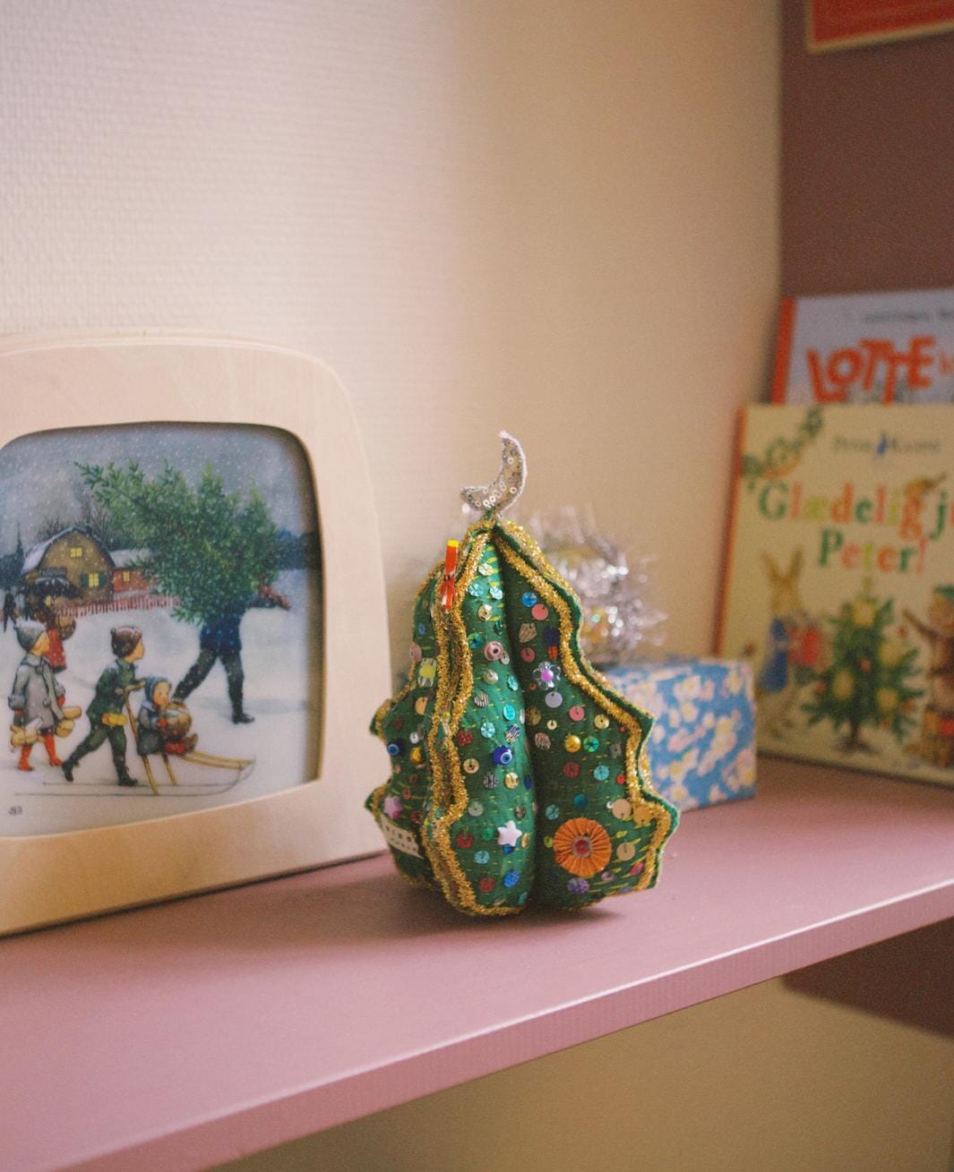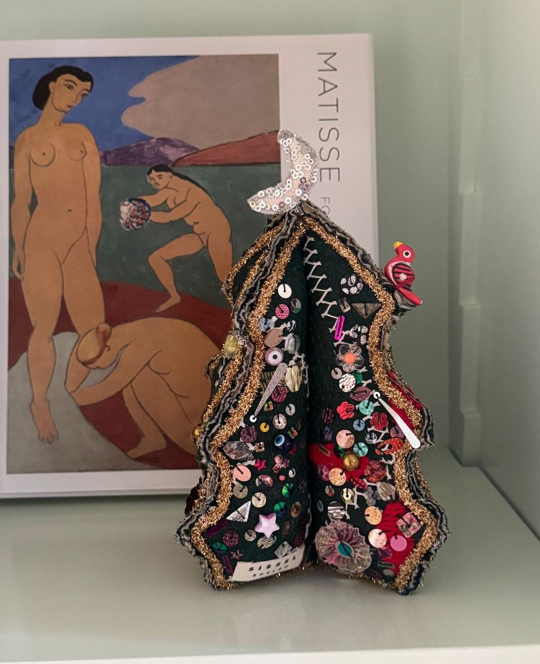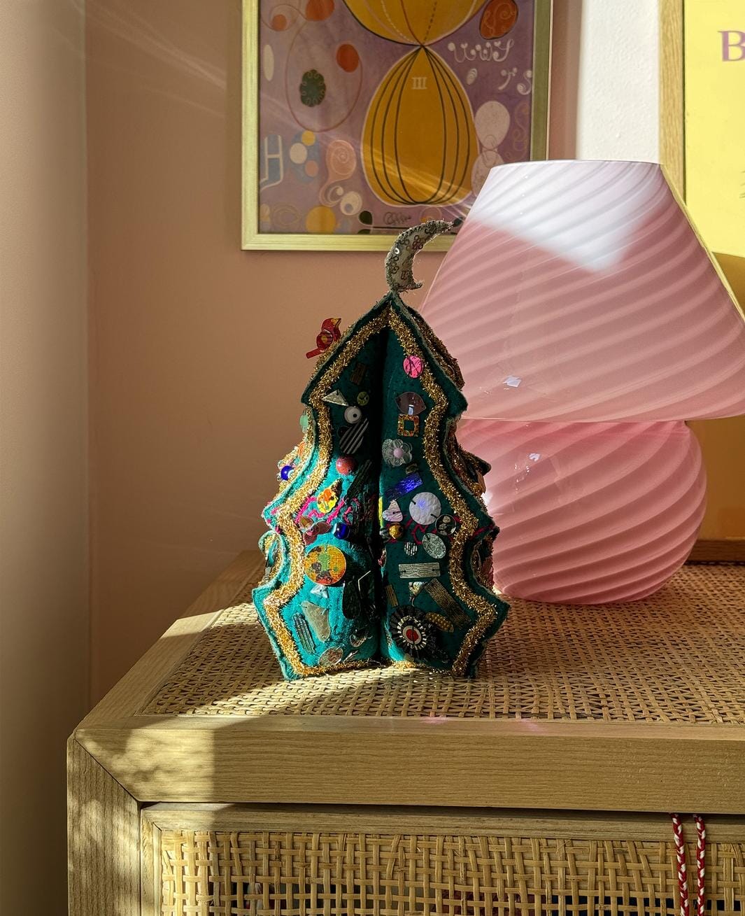 Dekorativt juletræ fra Sissel Edelbo, lavet af rester fra vintage kantha-tæpper. Træet er grønt med gyldne og sølv lurex langs kanterne og pyntet med Evil Eye-perler og rosetter.
