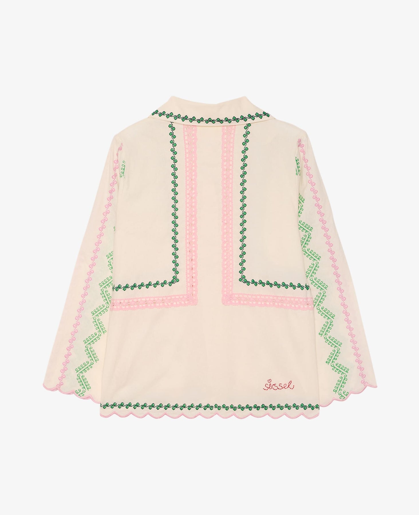 Skjorte fra Sissel Edelbo i off-white med grønt og pink blomsterbroderi. Skjorten har bølgende blondebånd og bølgede kanter med broderi.