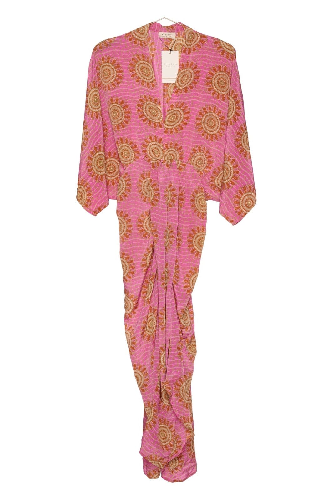 Lang kjole fra Sissel Edelbo lavet af genbrugt sari-stof. Kjolen har en dyb V-udskæring og 3/4 ærmer med et løst fald. Den kommer med et blomstret print i flere farver.