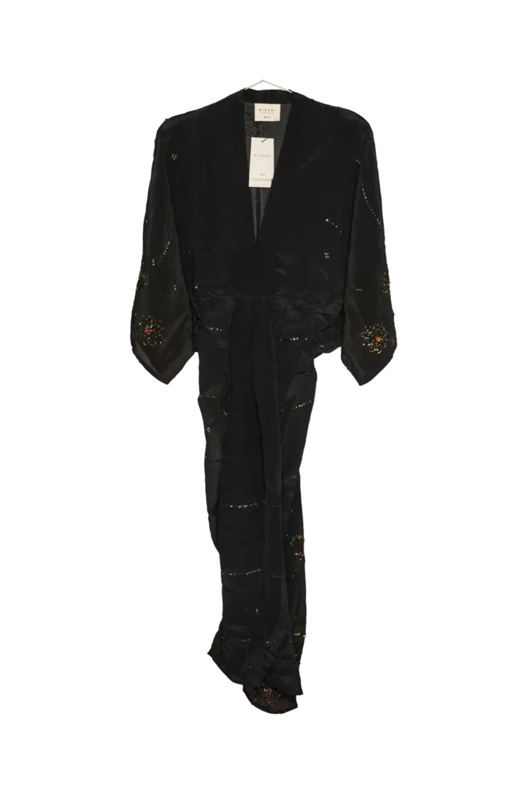 Sort silkekjole fra Sissel Edelbo lavet af genbrugte silkesarier. Kjolen har V-udskæring, 3/4 ærmer og bindebånd i taljen. Den er dekoreret med pailletter og perler på sort bund.