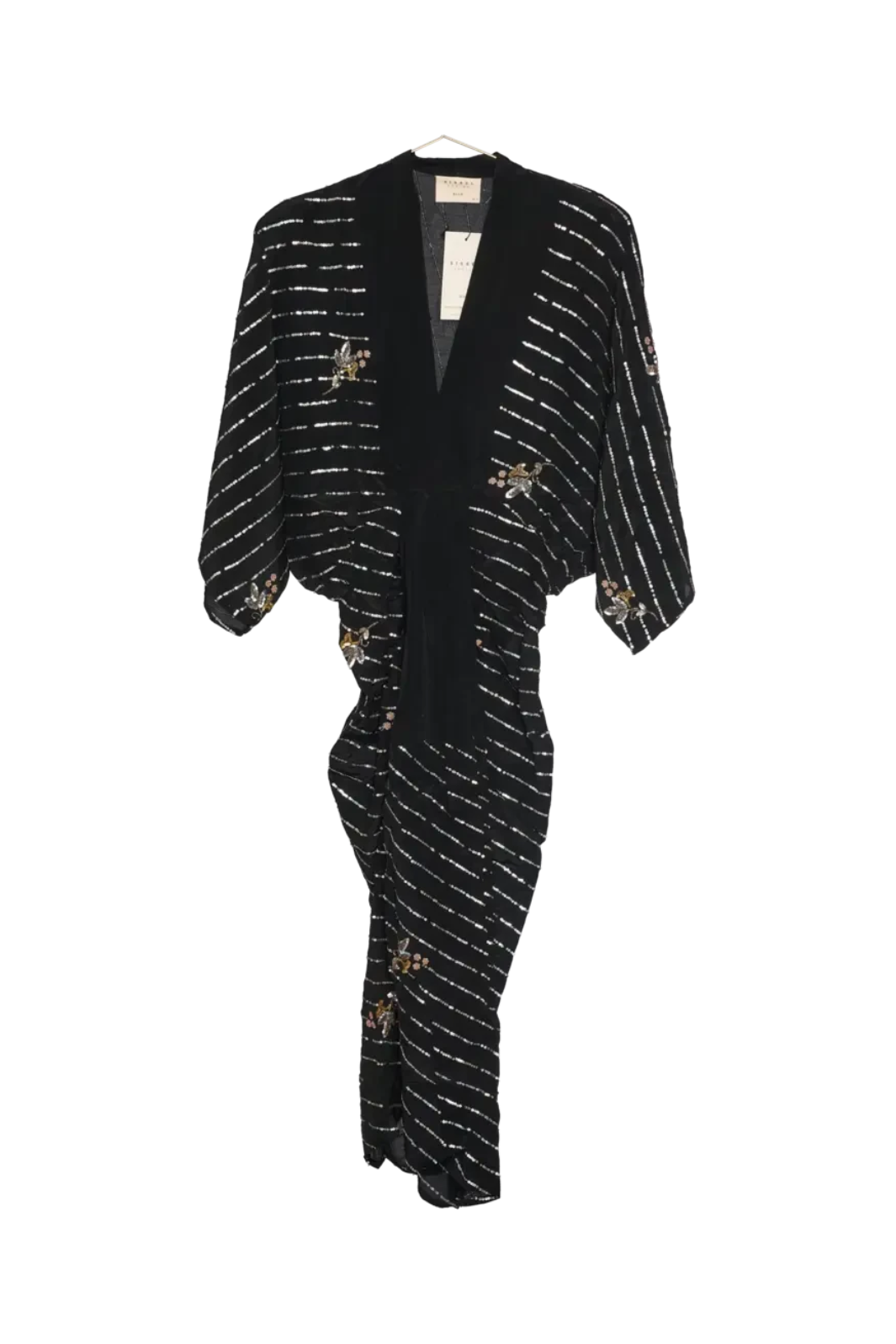 Sort silkekjole fra Sissel Edelbo med hvide diagonale striber og blomstermotiver. Kjolen er syet af genbrugte silkesarier med perler og pailletter som dekoration.