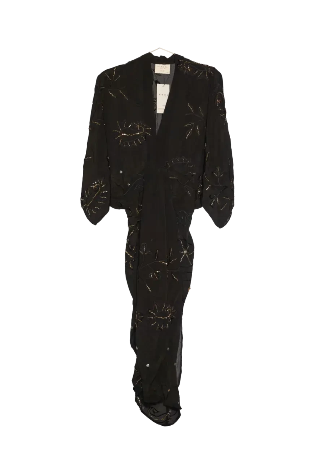 Sort silkekjole fra Sissel Edelbo lavet af genbrugte sarier. Kjolen har V-udskæring, 3/4 ærmer og er dekoreret med perler og pailletter, der skaber et glitrende udtryk.