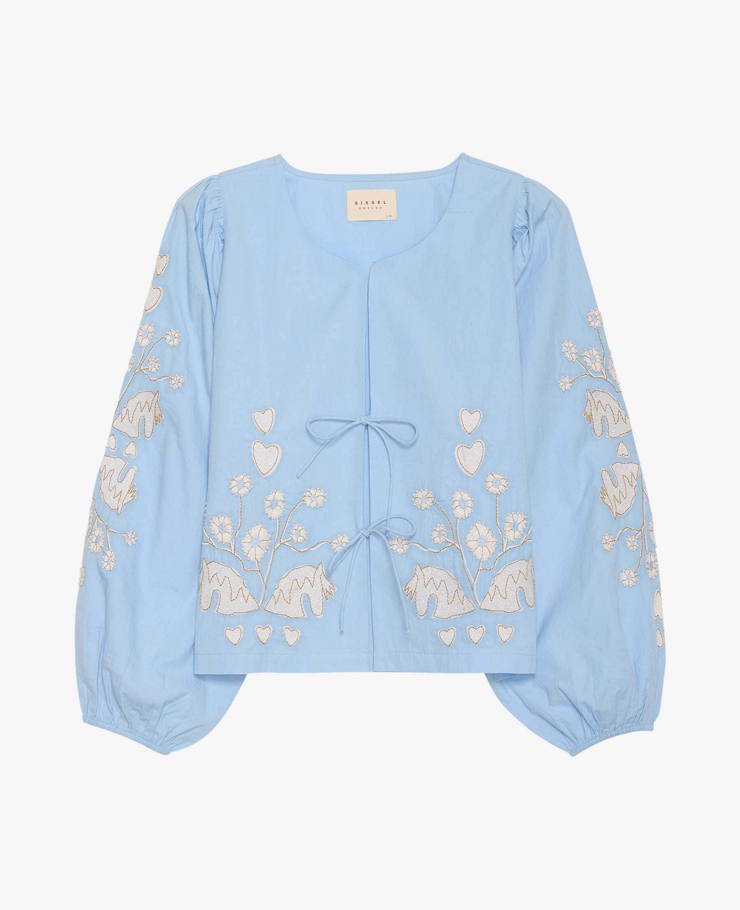 Lyseblå top fra Sissel Edelbo med broderede hjerter og blomster på fronten og ærmerne. Toppen har bindedetaljer foran og perledekorationer.