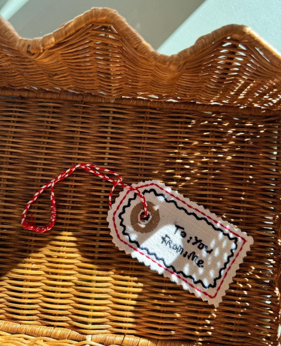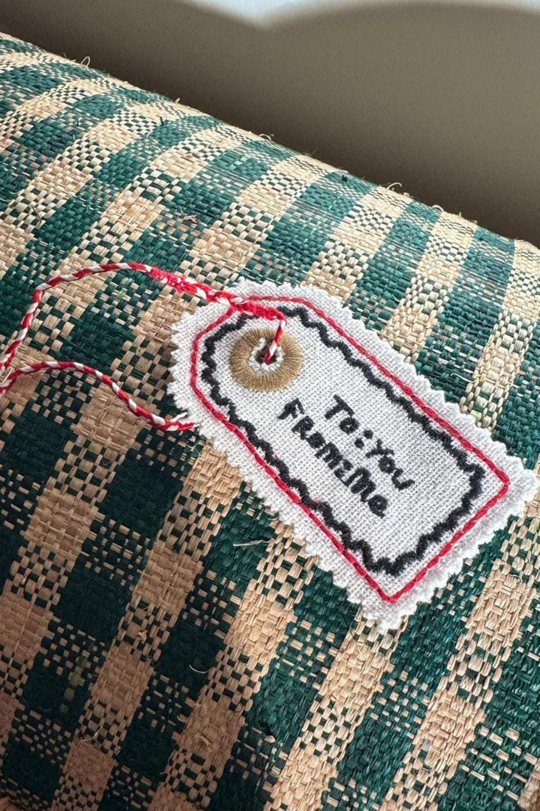 Et tagornament fra Sissel Edelbo, lavet af overskydende tweed bouclé-stof. Ornamentet er rektangulært med scallop-kanter og en rød/hvid flettet snor.