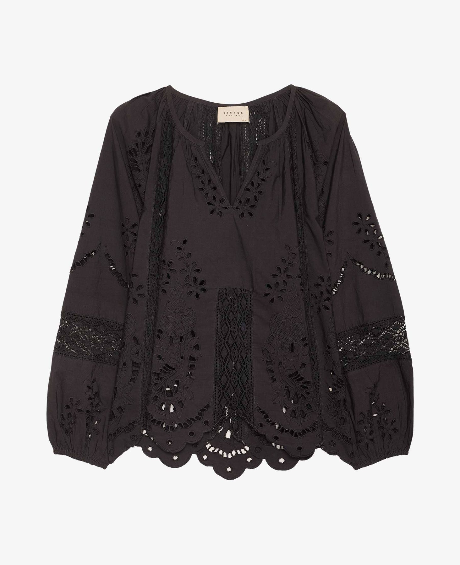 Sort top fra Sissel Edelbo, lavet af 100 % økologisk bomuld. Toppen har en løs pasform og er dekoreret med blonder, broderier og flæser i sort.