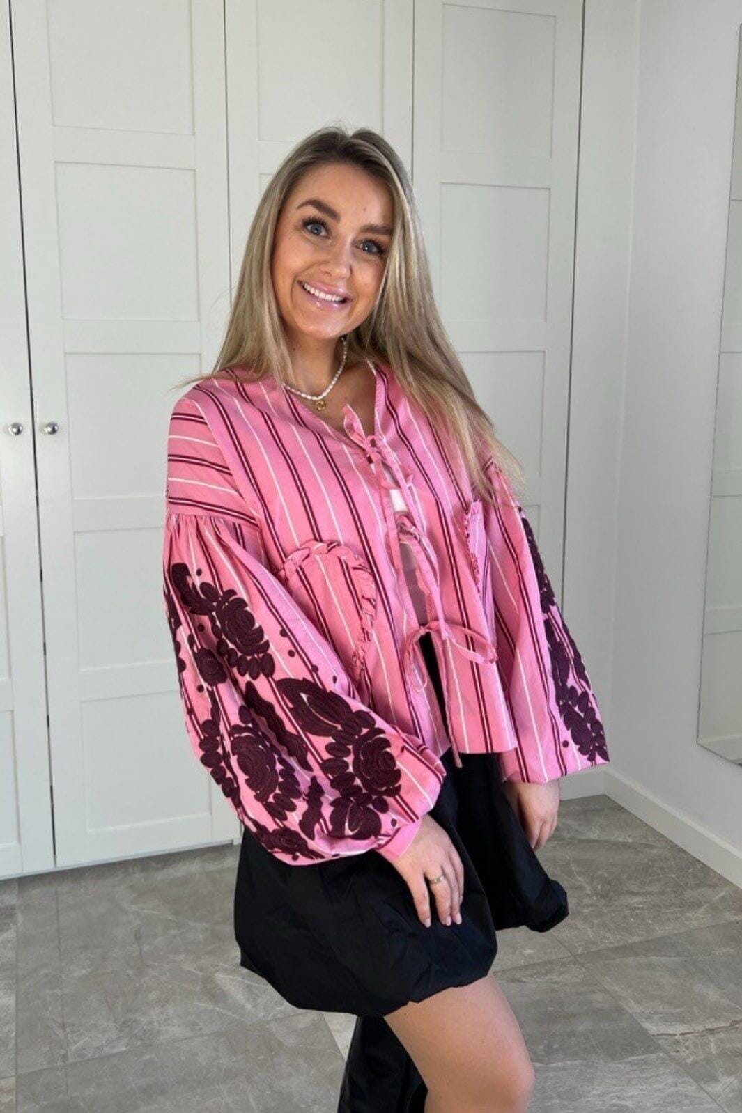 Stribet top fra Sissel Edelbo i økologisk bomuld. Den pink top har bordeauxfarvede blomstermønstre på ærmerne og tre sæt bindebånd foran.