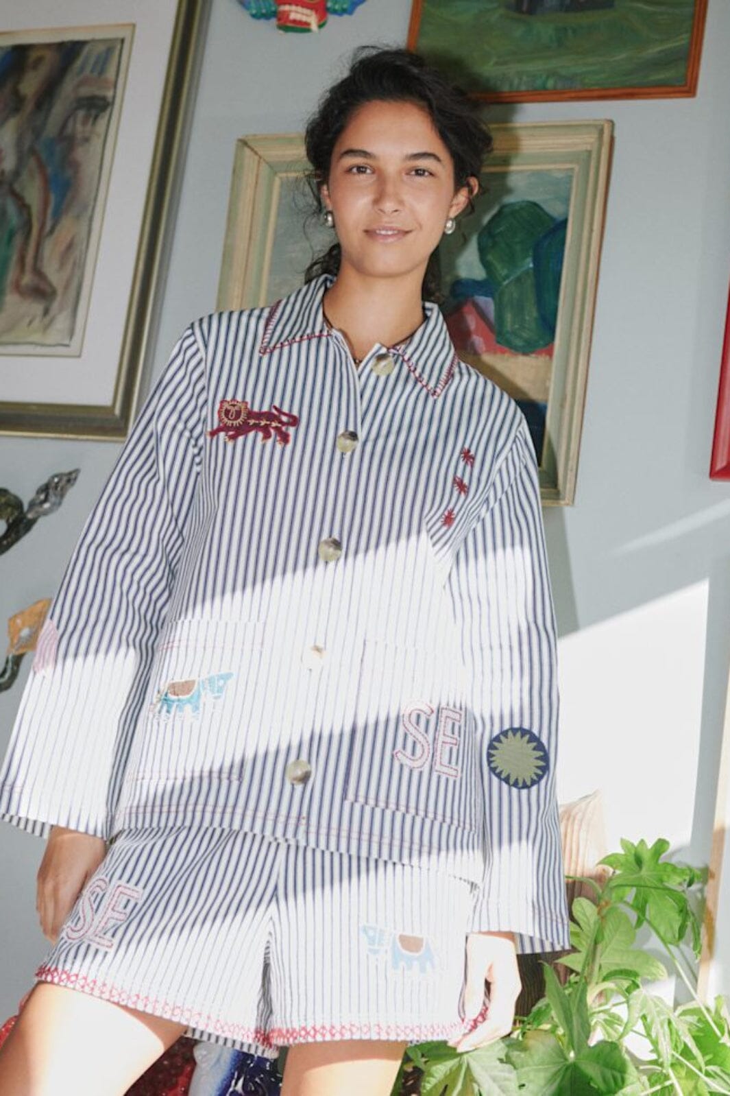 Stribet jakke fra Sissel Edelbo med broderede motiver som sol, tiger og hest. Jakken er lavet af overskydende bomuldslærred med 3 % stræk.