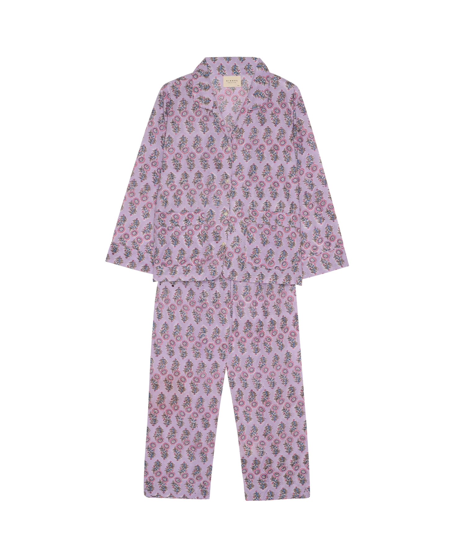 Pyjamassæt fra Sissel Edelbo i lilla med blomstret mønster. Skjorten har knapfront og lille krave, og bukserne har elastik i taljen.