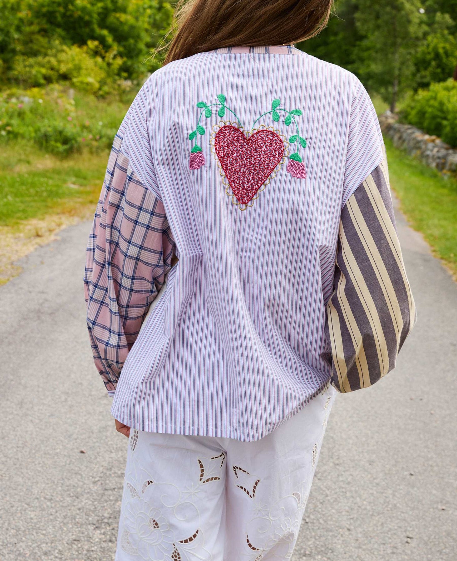 Skjorte fra Sissel Edelbo med et flerfarvet patchwork-design i tern, striber og blomsterprint. Skjorten har perlemorsknapper og et broderet hjerte på ryggen.