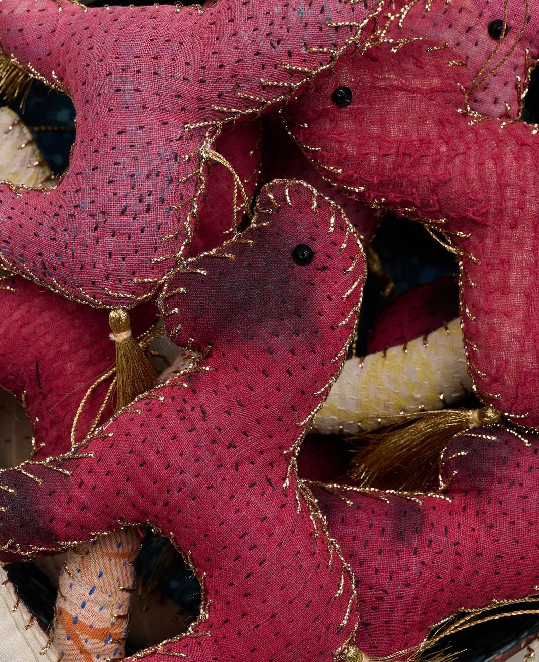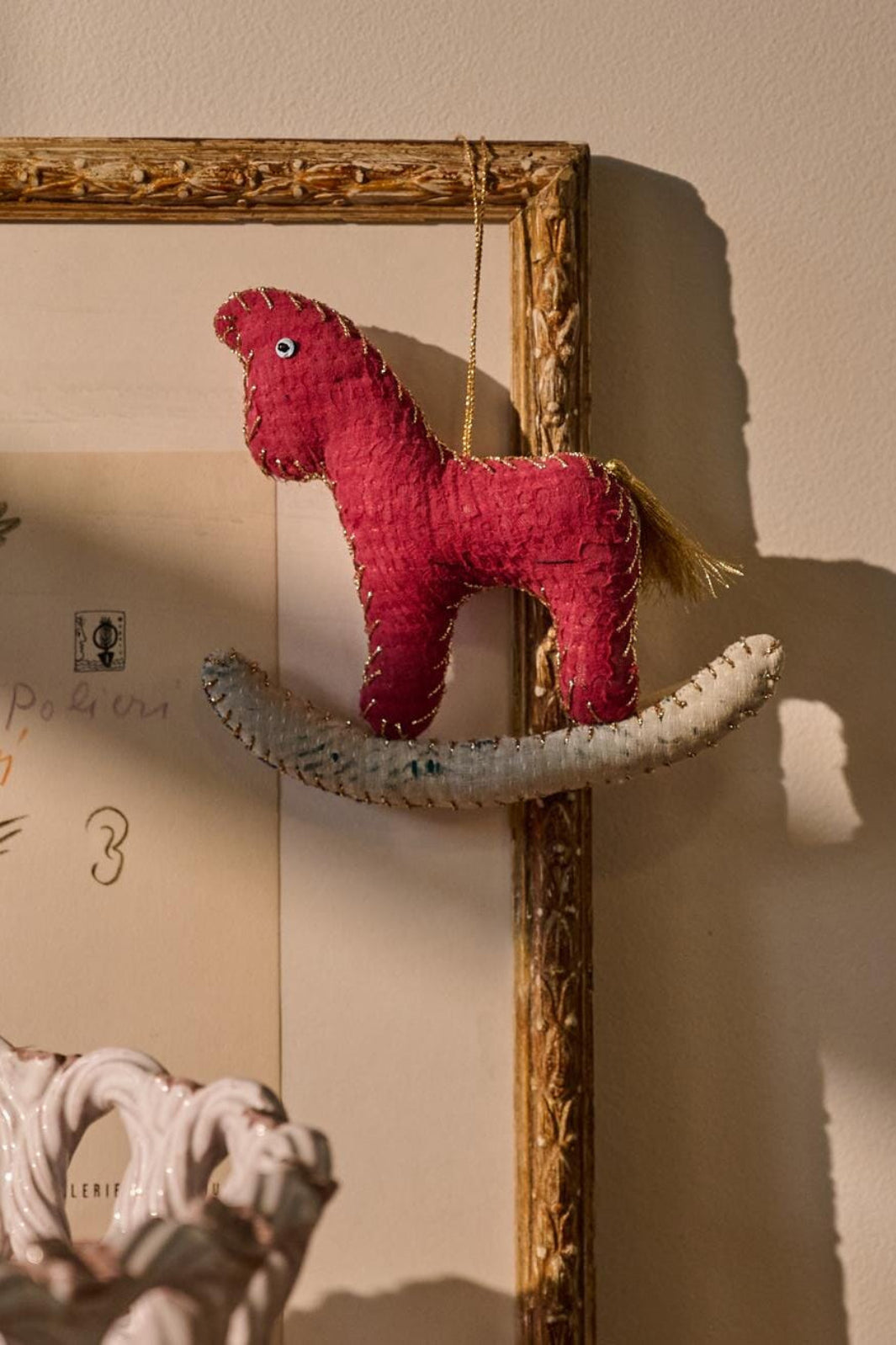 Gyngehest-ornament fra Sissel Edelbo, lavet af rester fra kantha-tæpper. Ornamentet har en rød og mørkerød farve med en hvid, buet base og en gylden hængesnor.