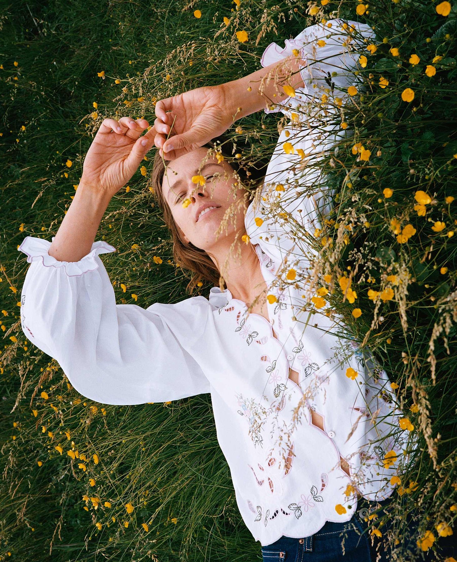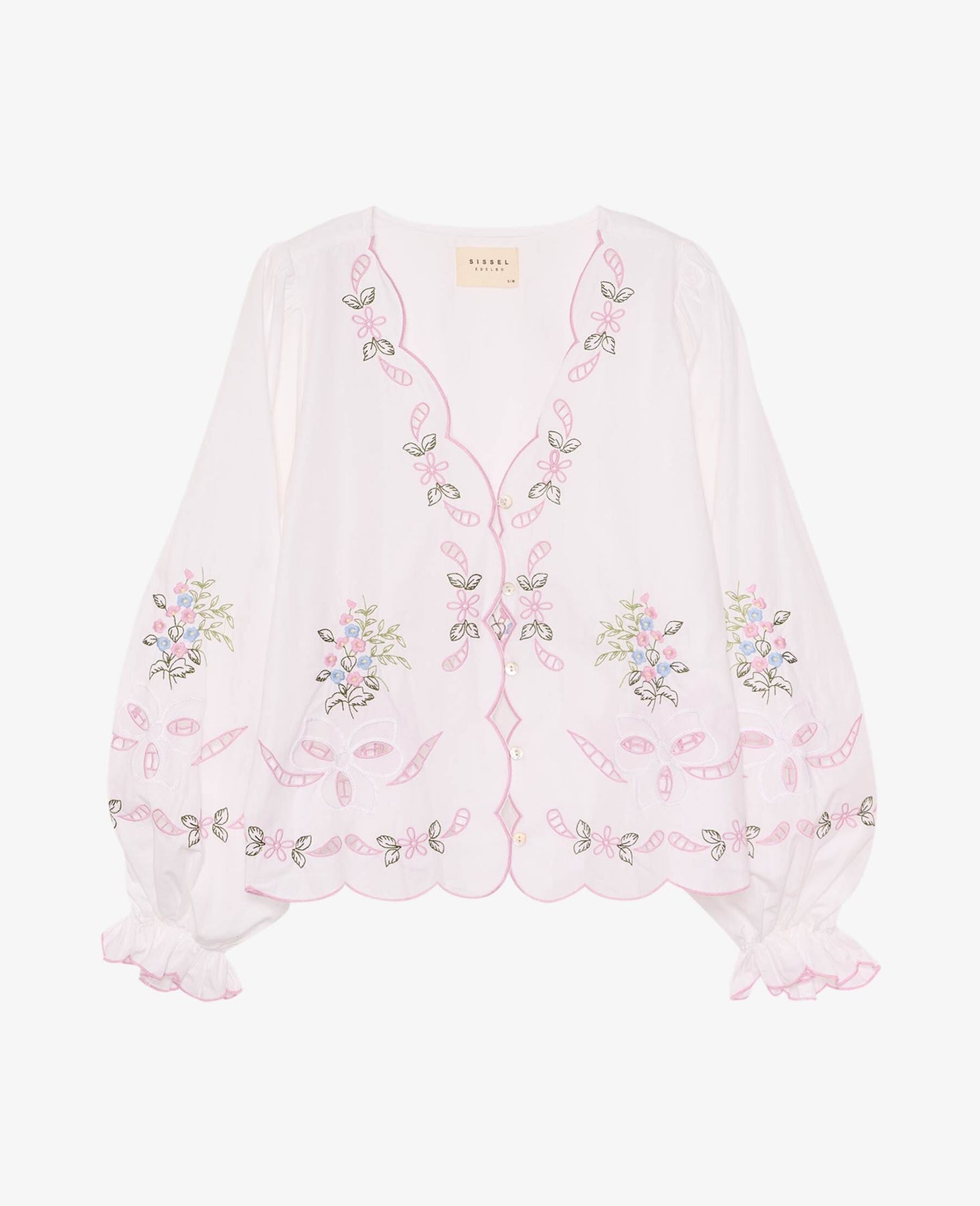 Hvid top fra Sissel Edelbo med pastelfarvet blomsterbroderi på fronten og ærmerne. Toppen har en løs pasform og lange ærmer.
