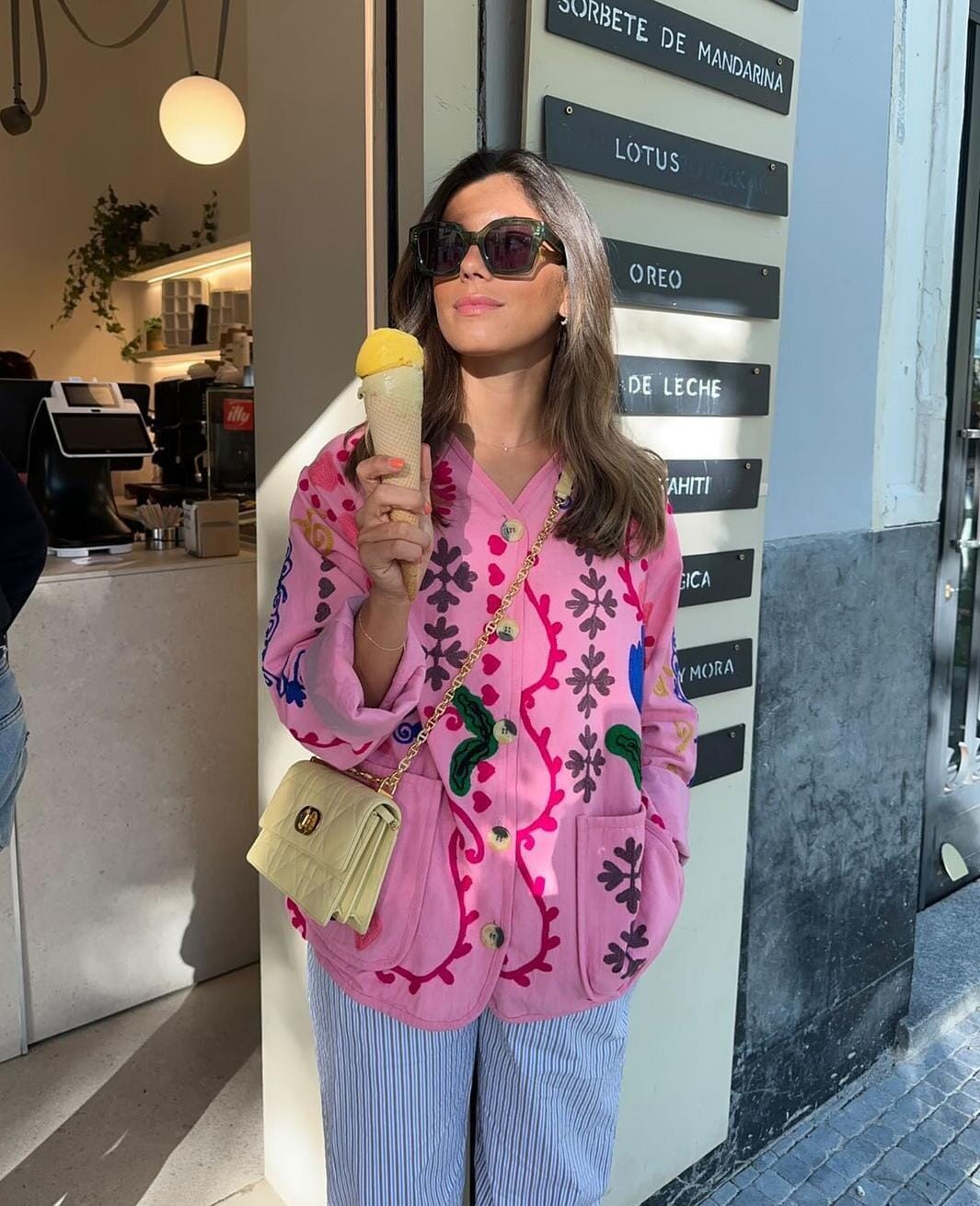 Lyserød jakke fra Sissel Edelbo med broderede blomster- og naturmotiver. Jakken har en løs pasform med to forlommer og knaplukning foran.