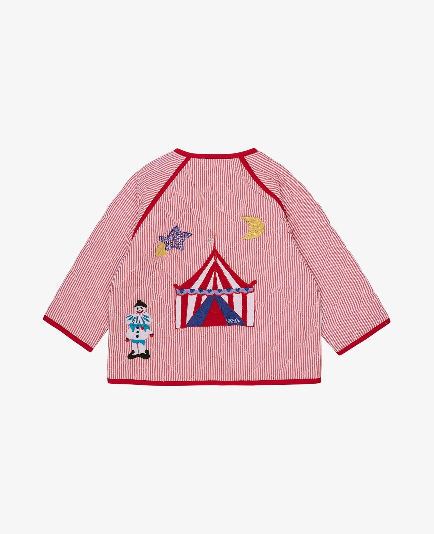 Quiltet jakke i rød-hvidt stribet bomuld med cirkusmotiver. Designet har håndlavede detaljer med broderi, perler og pailletter, der giver jakken et kunstnerisk præg.
