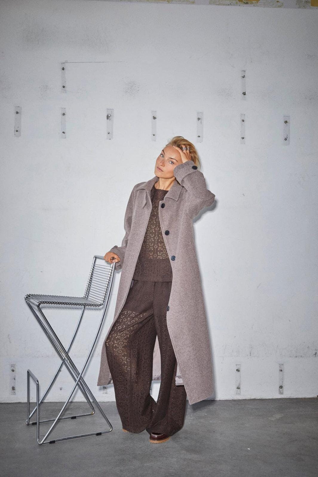 Lang frakke fra Sisters Point i brun meleret farve. Frakken er fremstillet af en blanding af polyester, akryl og viskose.