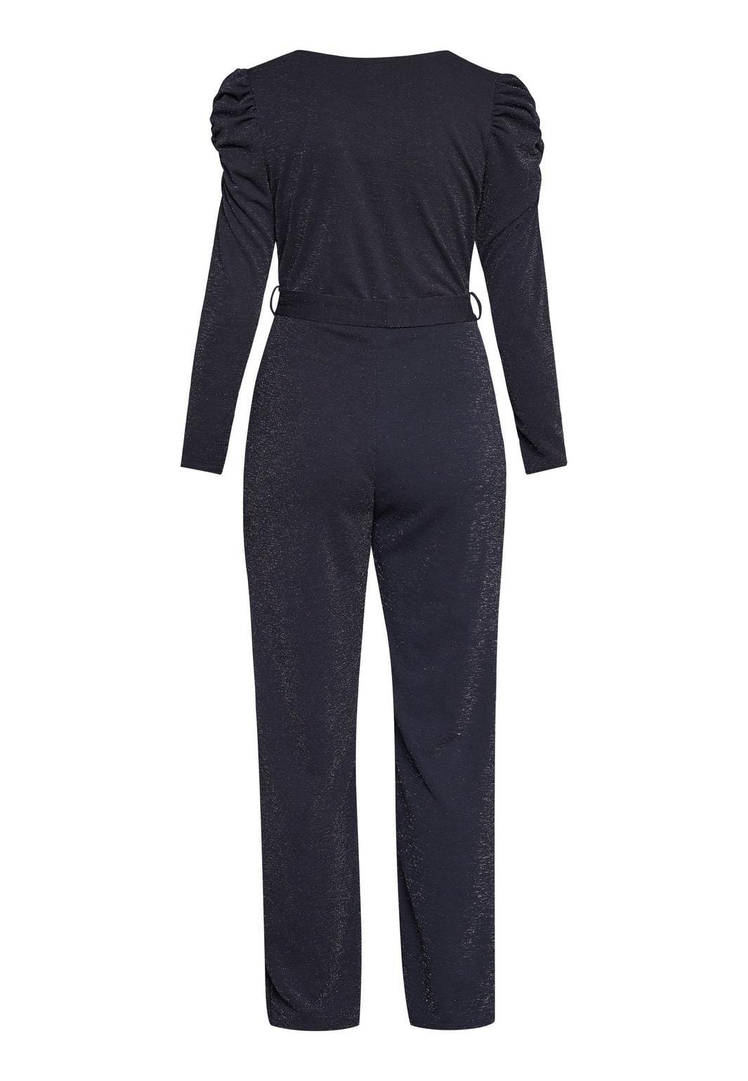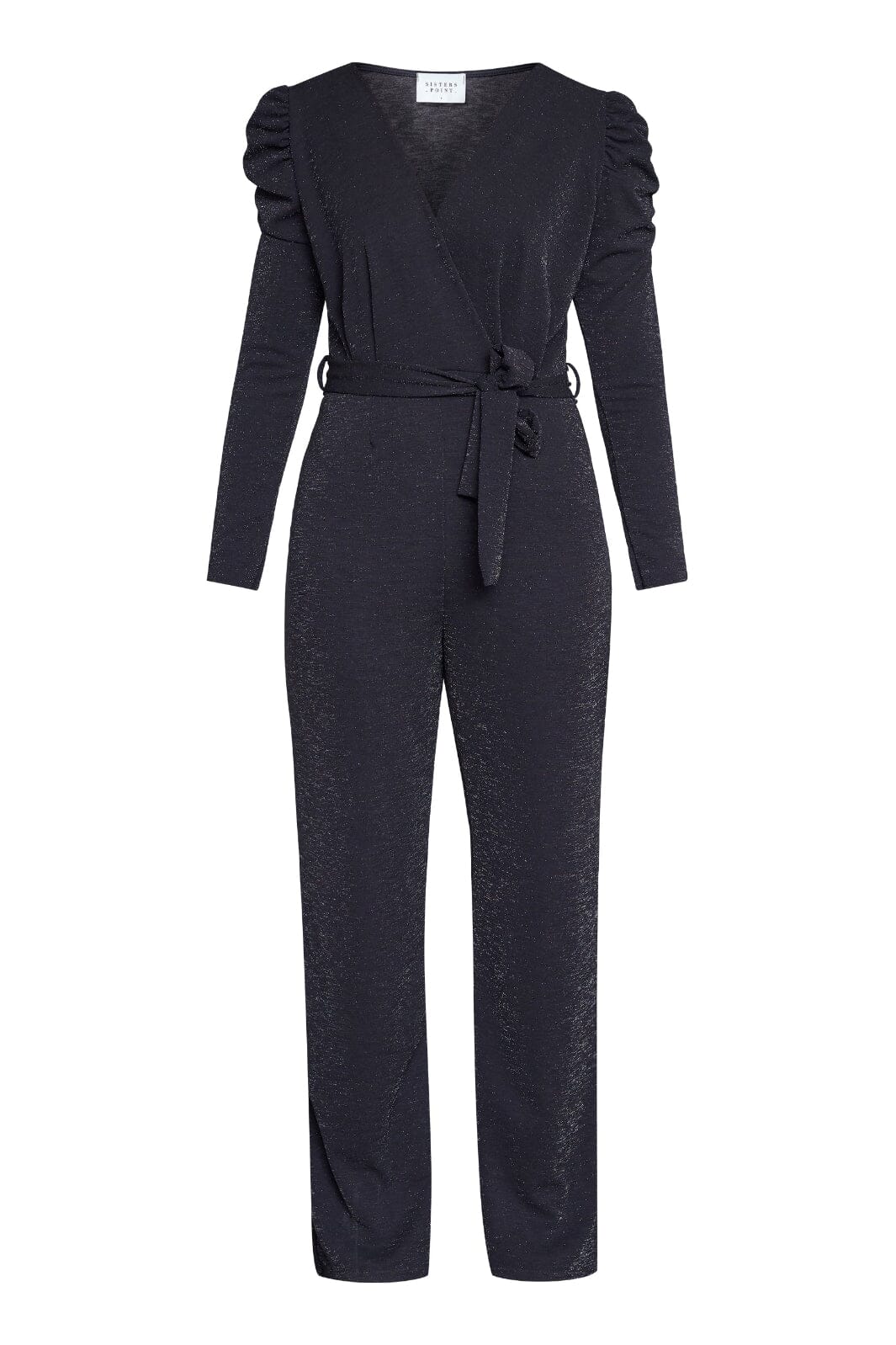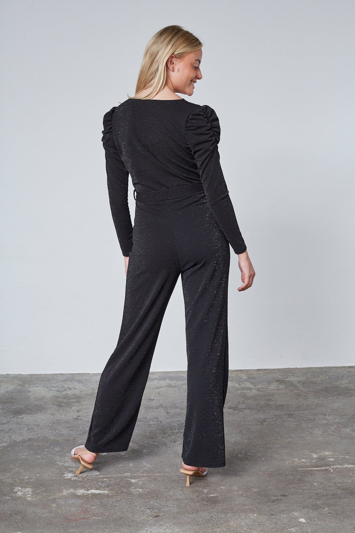 Sort buksedragt fra Sisters Point med sølvglimmer-effekt. Den har V-udskæring, pufærmer med rynkede detaljer ved skuldrene og bindebånd i taljen.