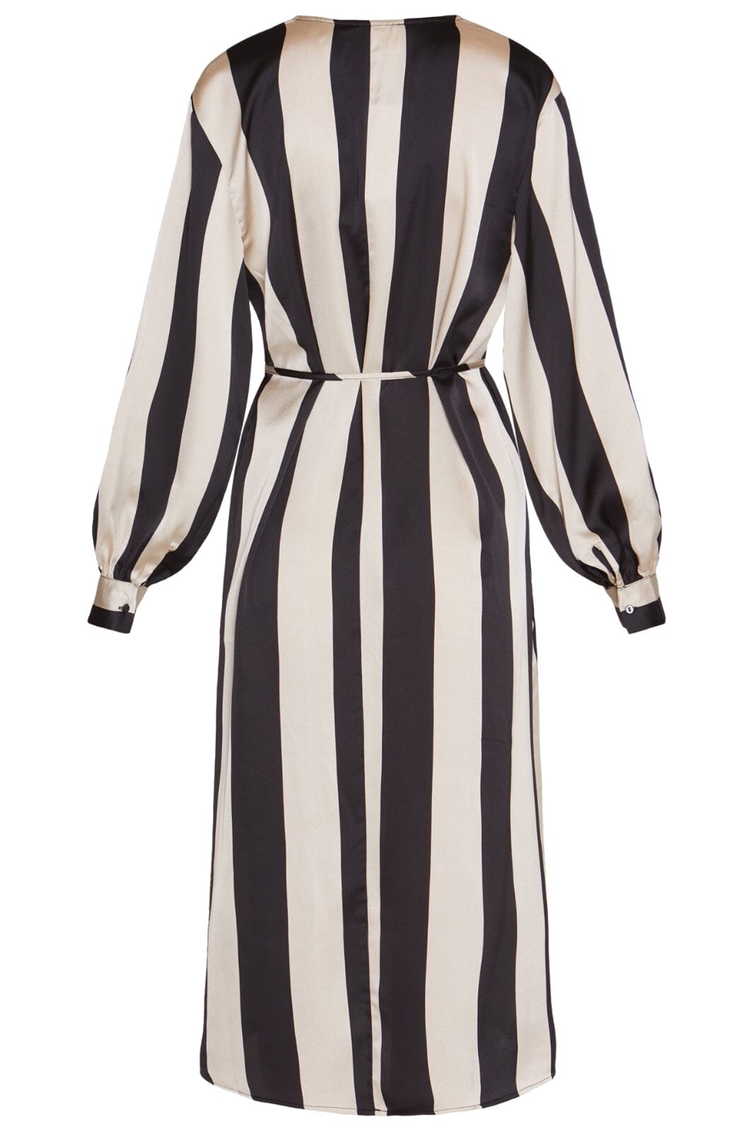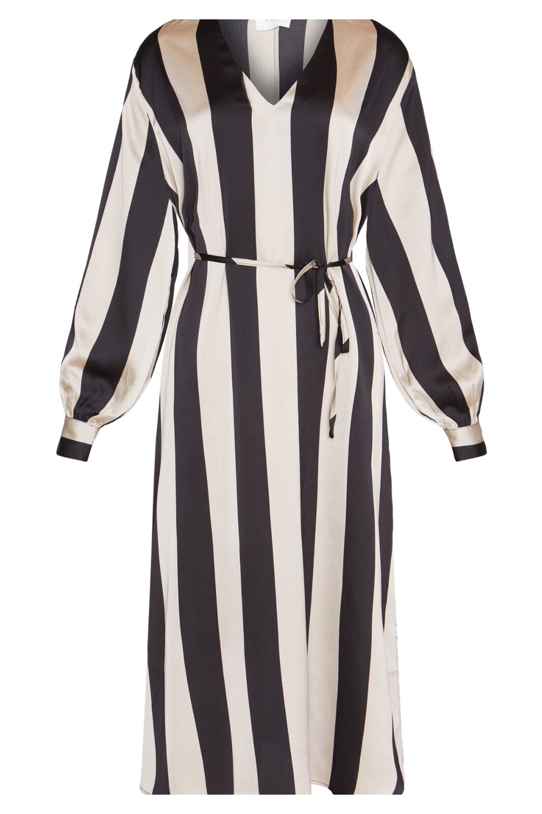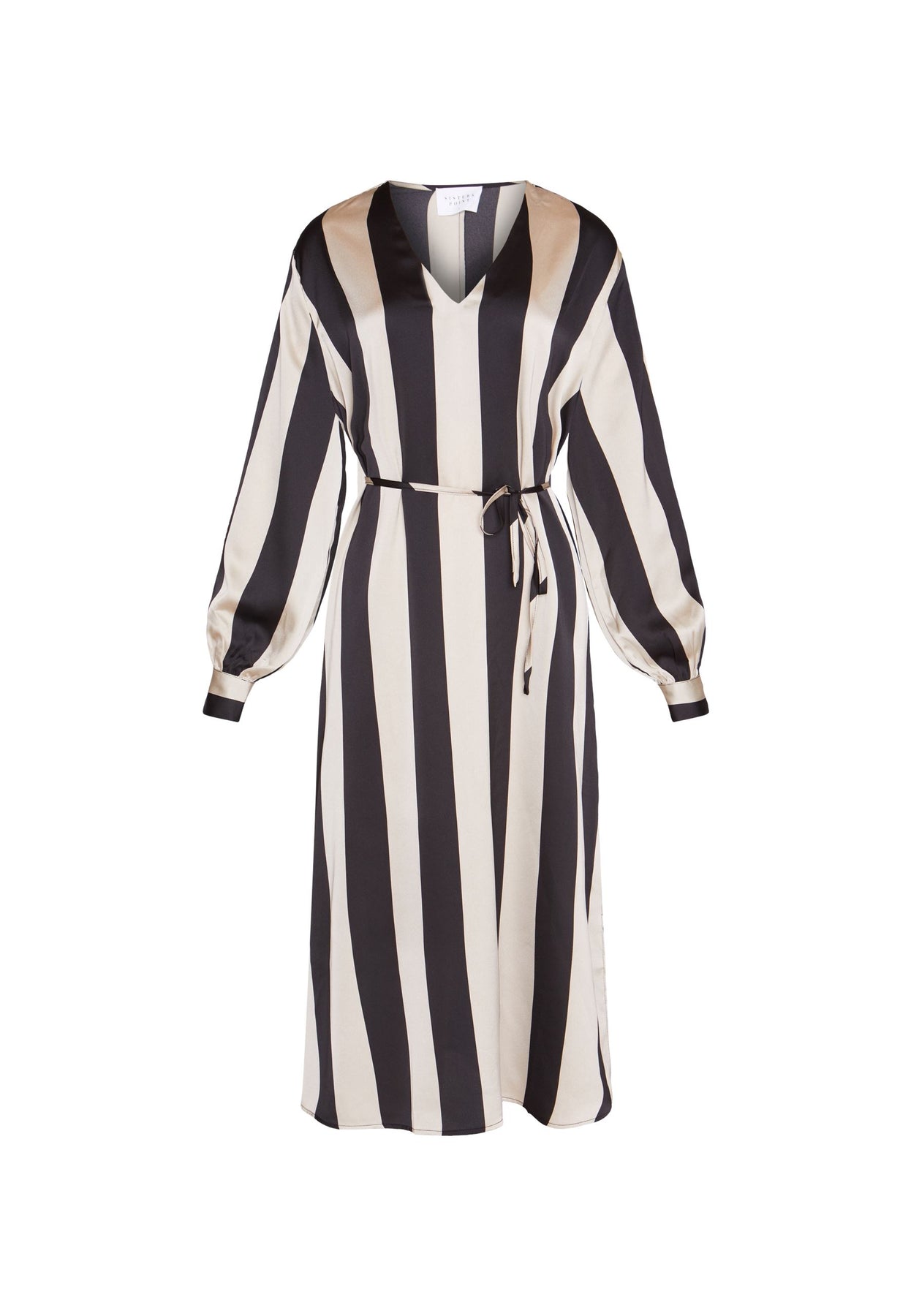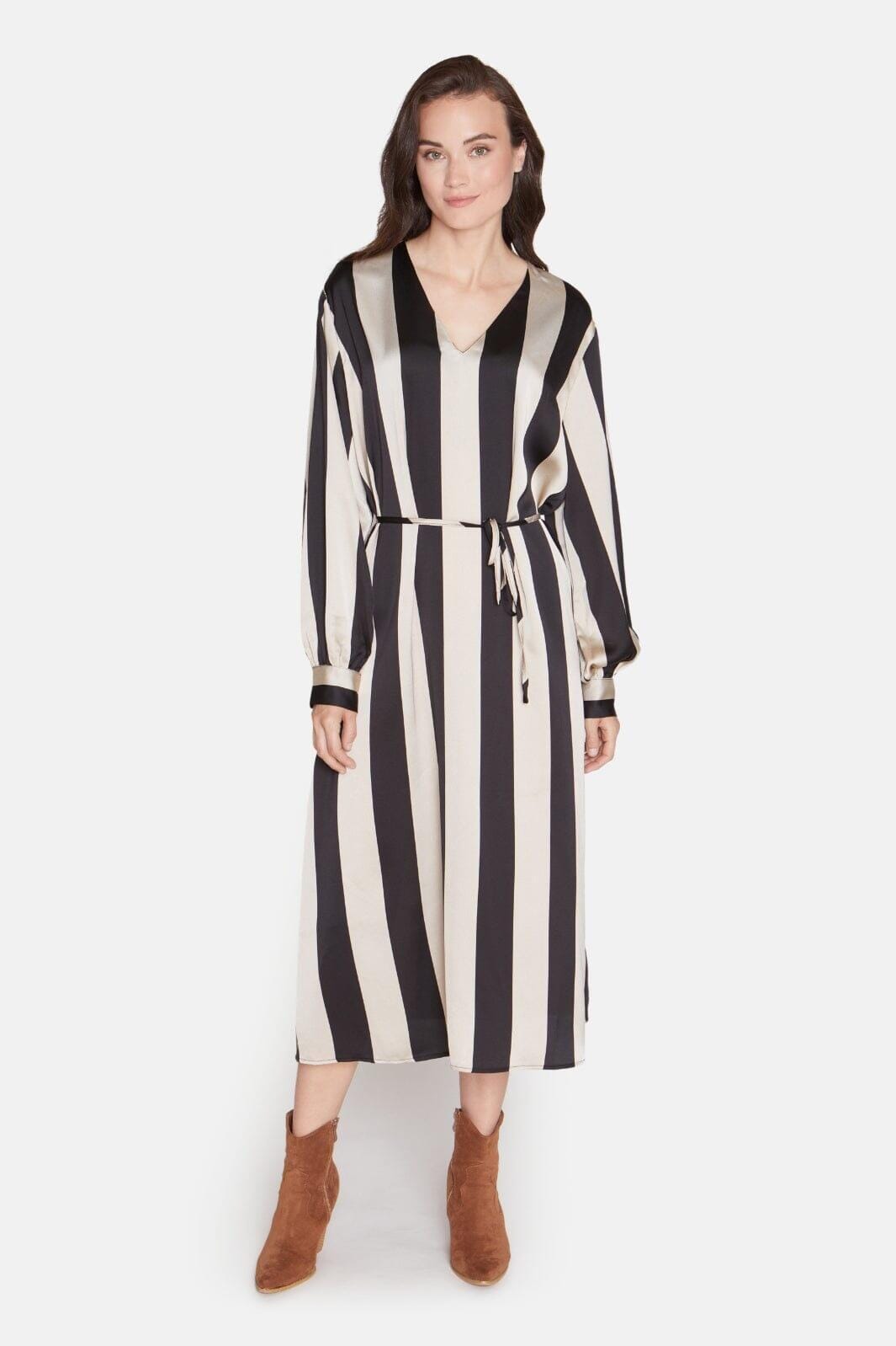 Lang kjole med et aftageligt bælte i taljen. Kjolen har en V-hals, og er tætsiddende nede ved håndleddende. Modellen er 177 cm høj, og har enstørrelse S på.
