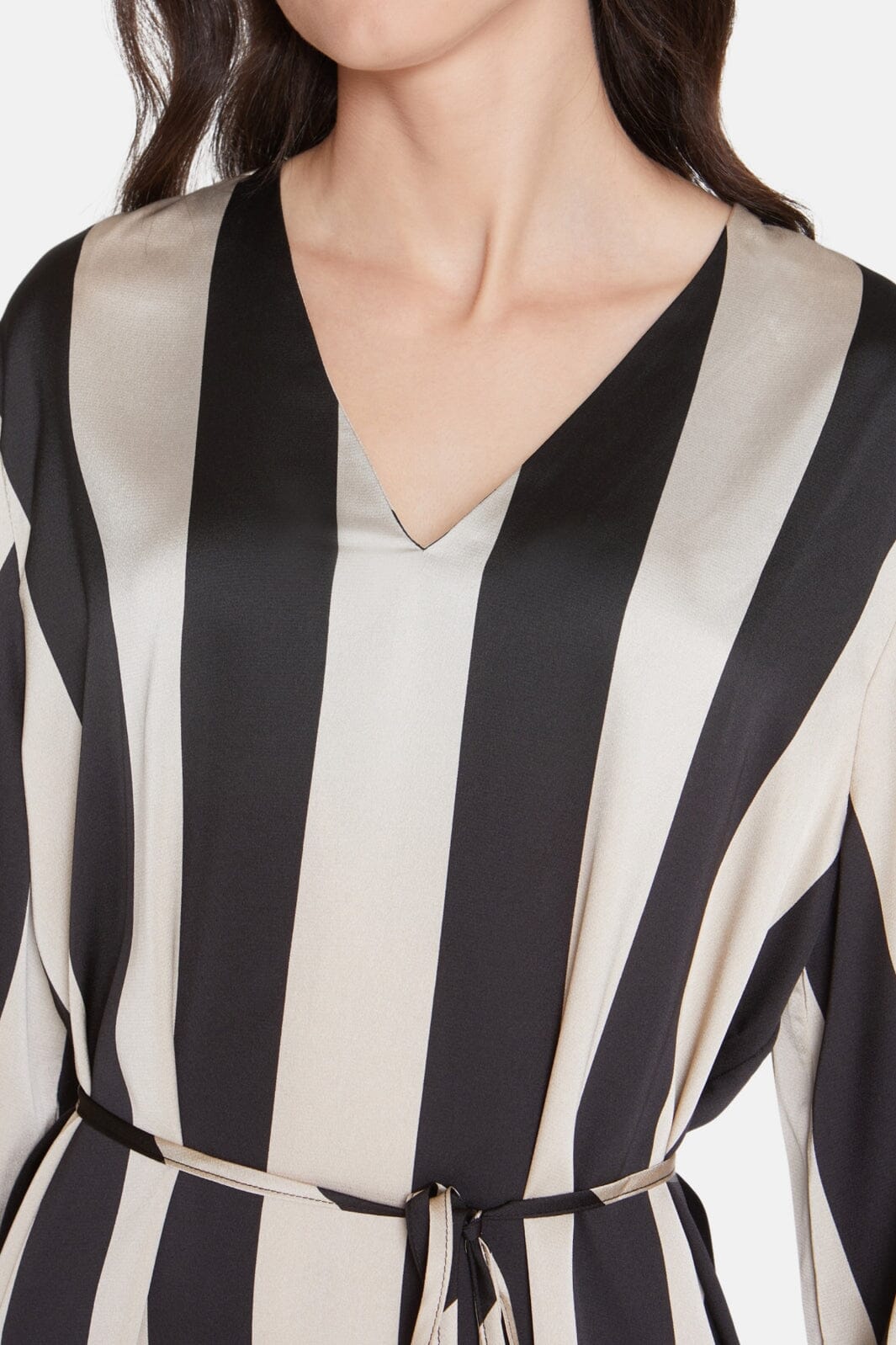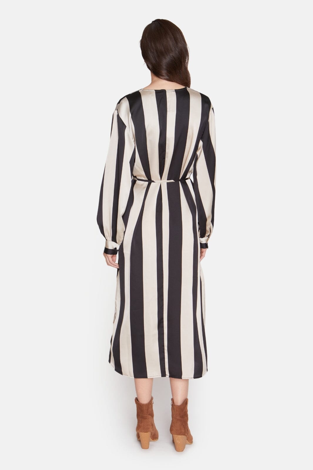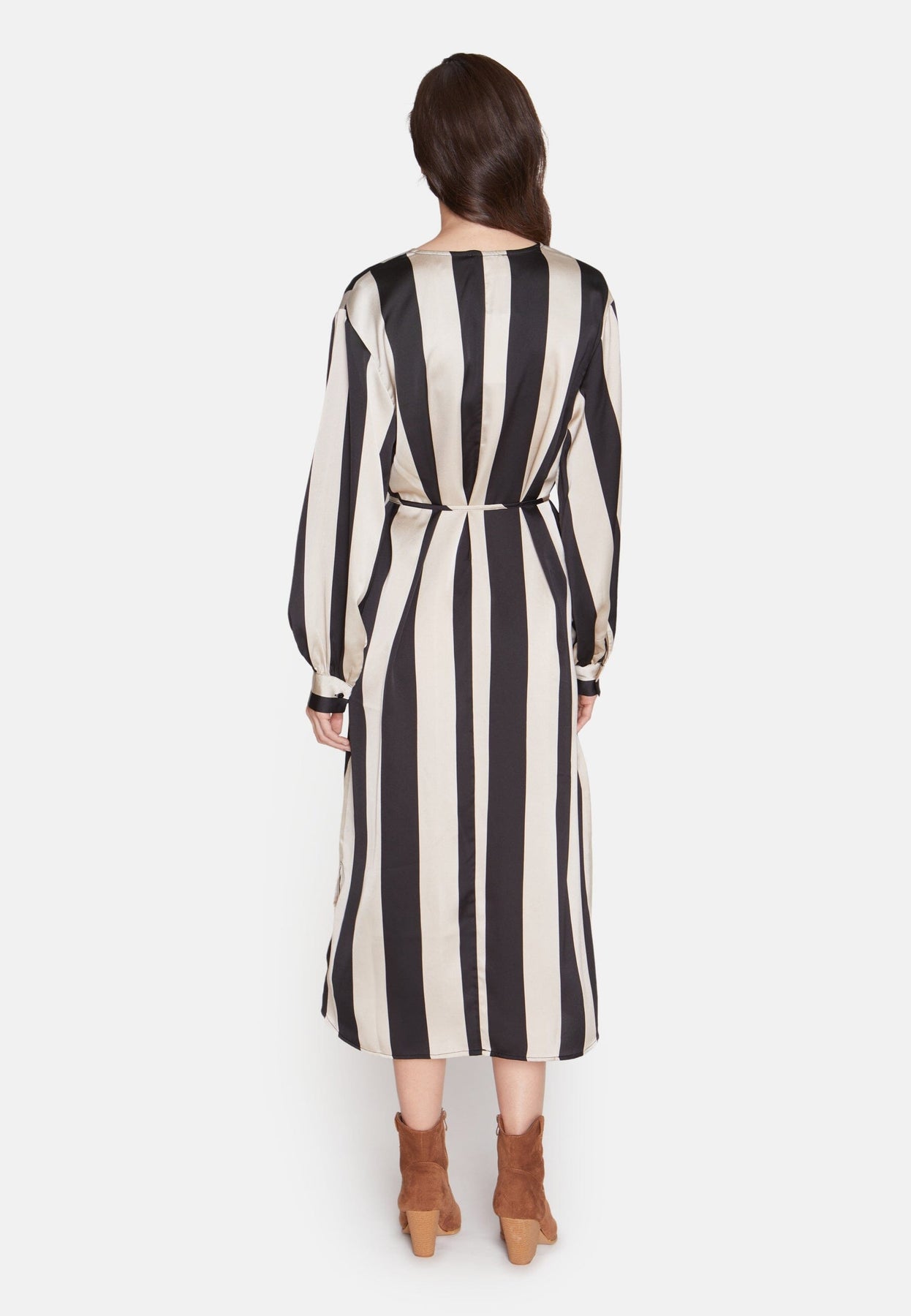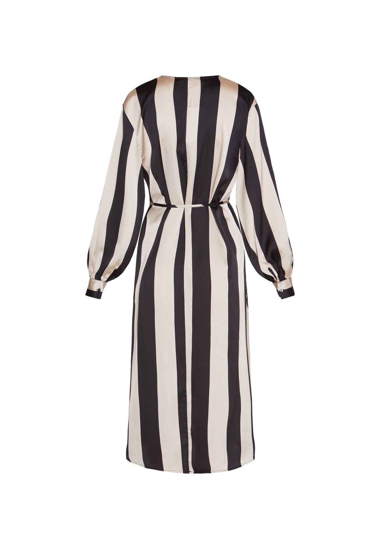 Lang kjole med et aftageligt bælte i taljen. Kjolen har en V-hals, og er tætsiddende nede ved håndleddende. Modellen er 177 cm høj, og har enstørrelse S på.