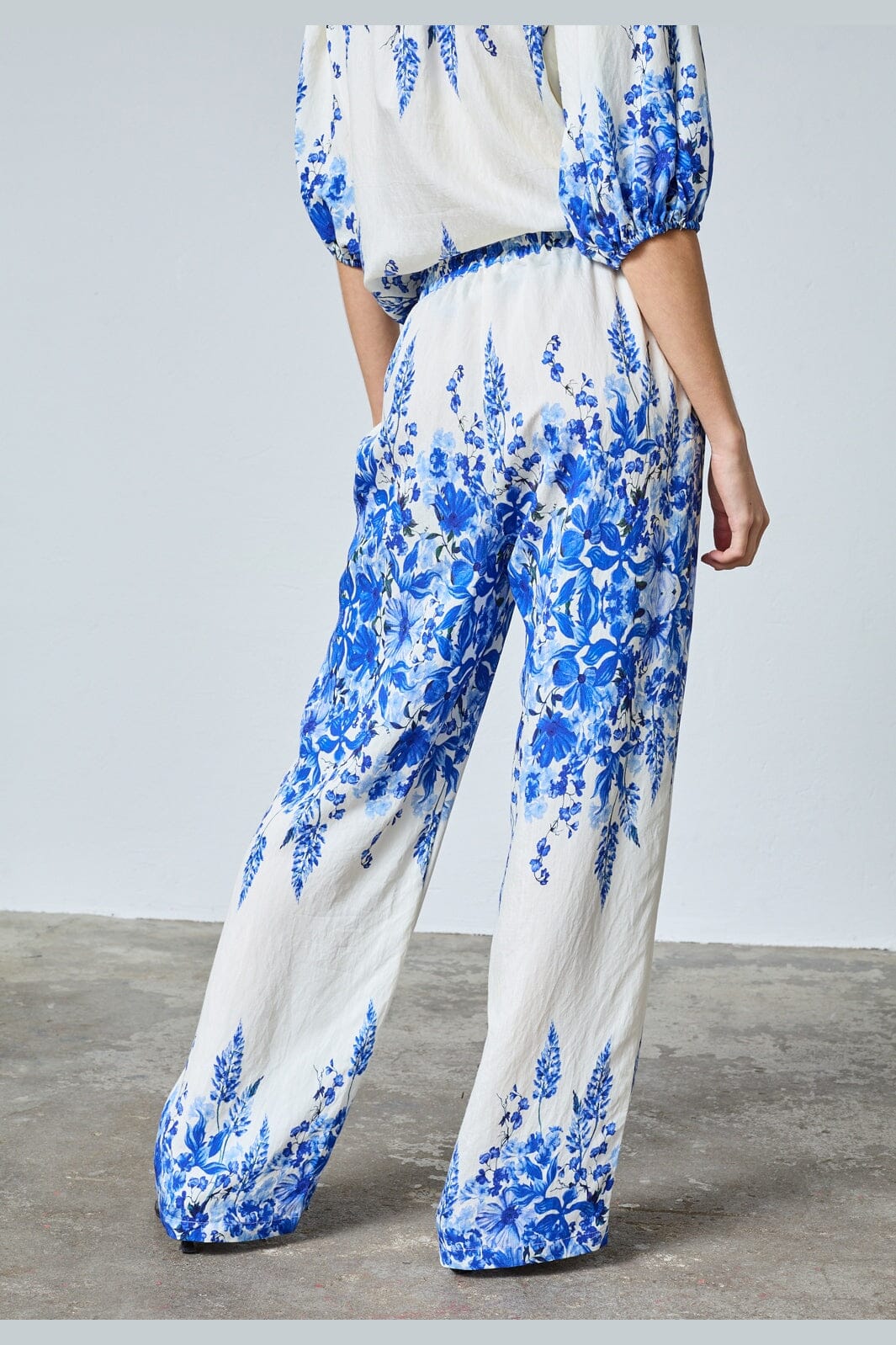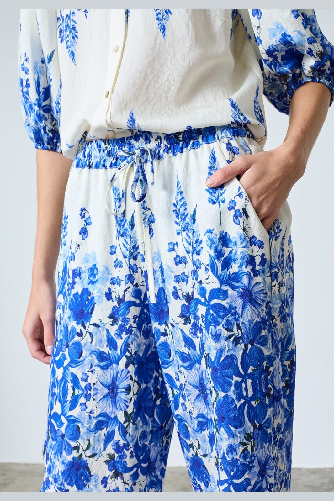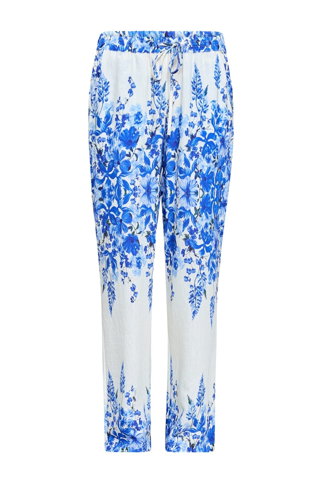 Bukser fra Sisters Point med et blåt blomstermønster på hvid baggrund. Bukserne er lavet af 80 % viskose og 20 % polyamid.