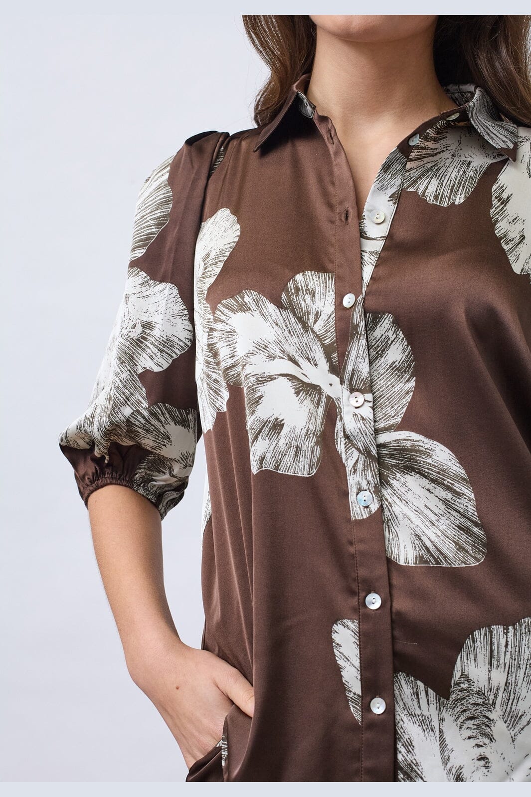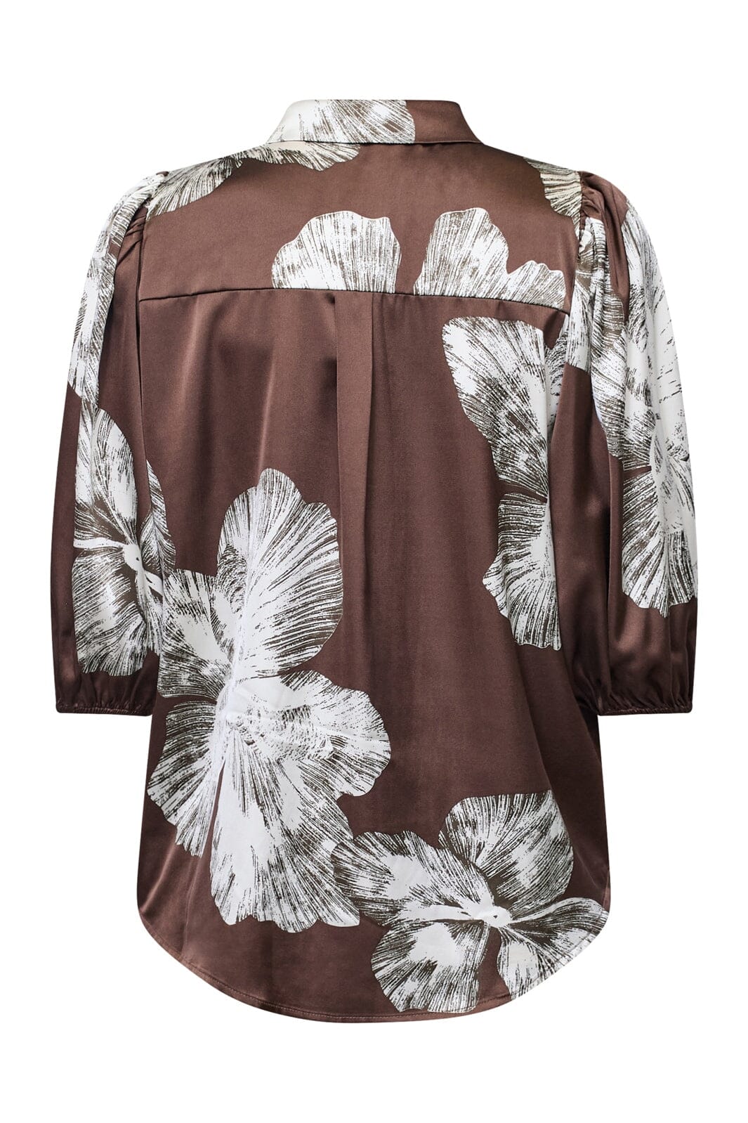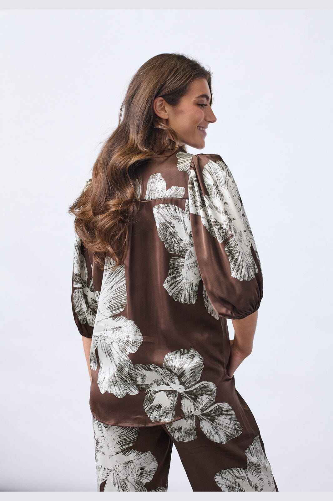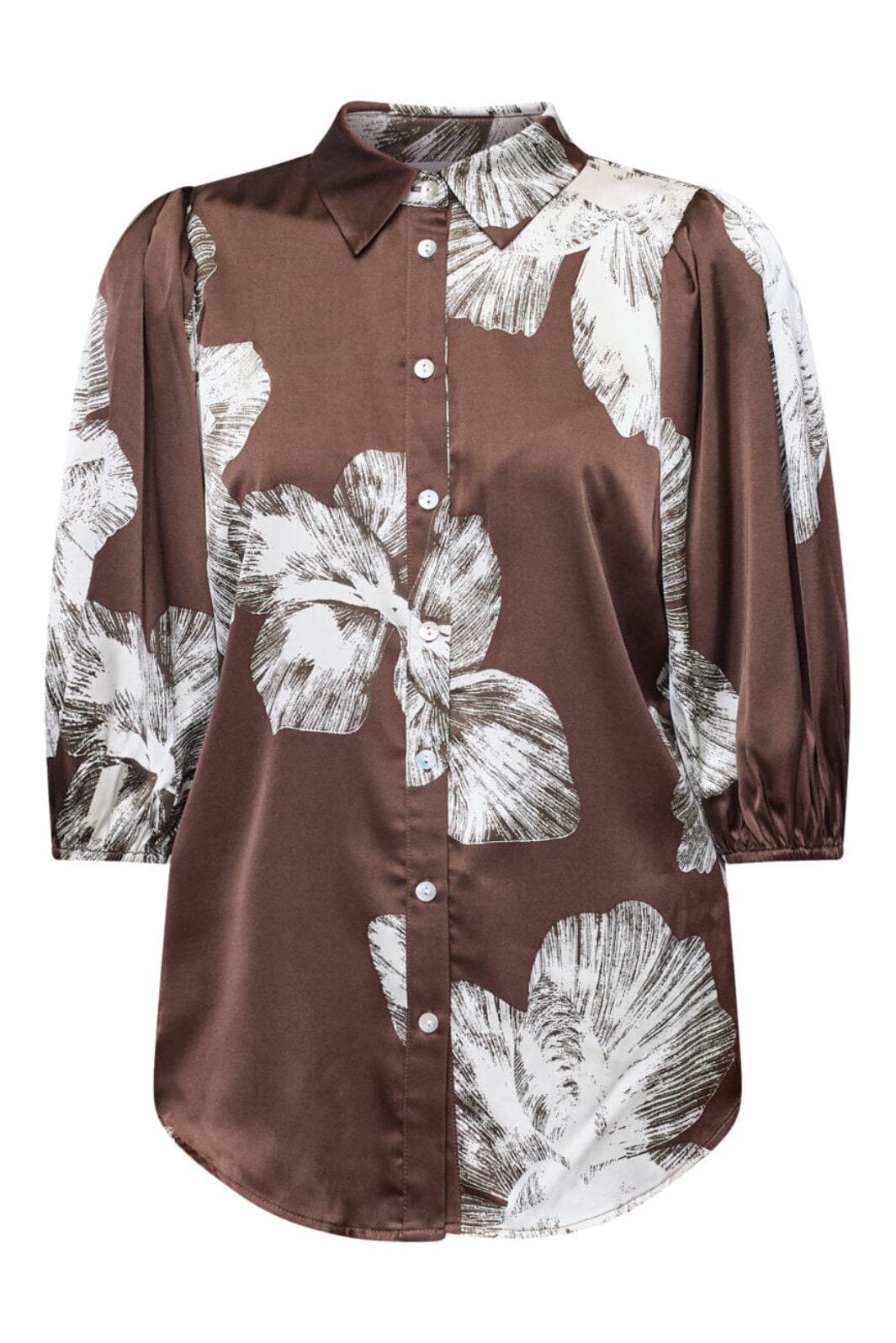 Skjorte fra Sisters Point i brun satin med grafisk blomsterprint i hvide nuancer. Skjorten har en klassisk krave og knaplukning.