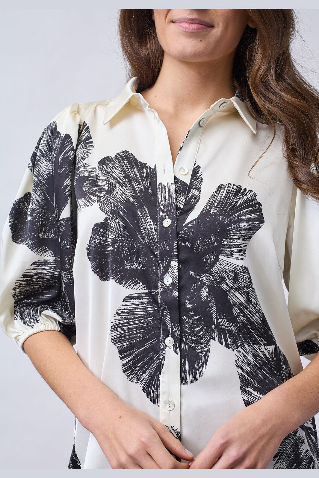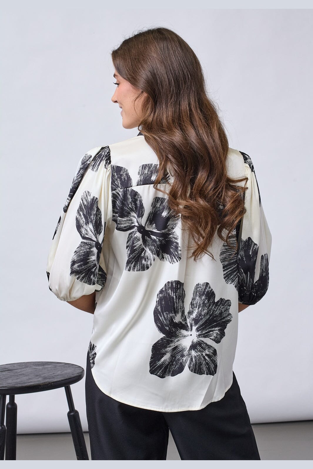 En satinsskjorte fra Sisters Point med grafisk blomsterprint i sort på cremefarvet baggrund. Skjorten har en løs pasform.
