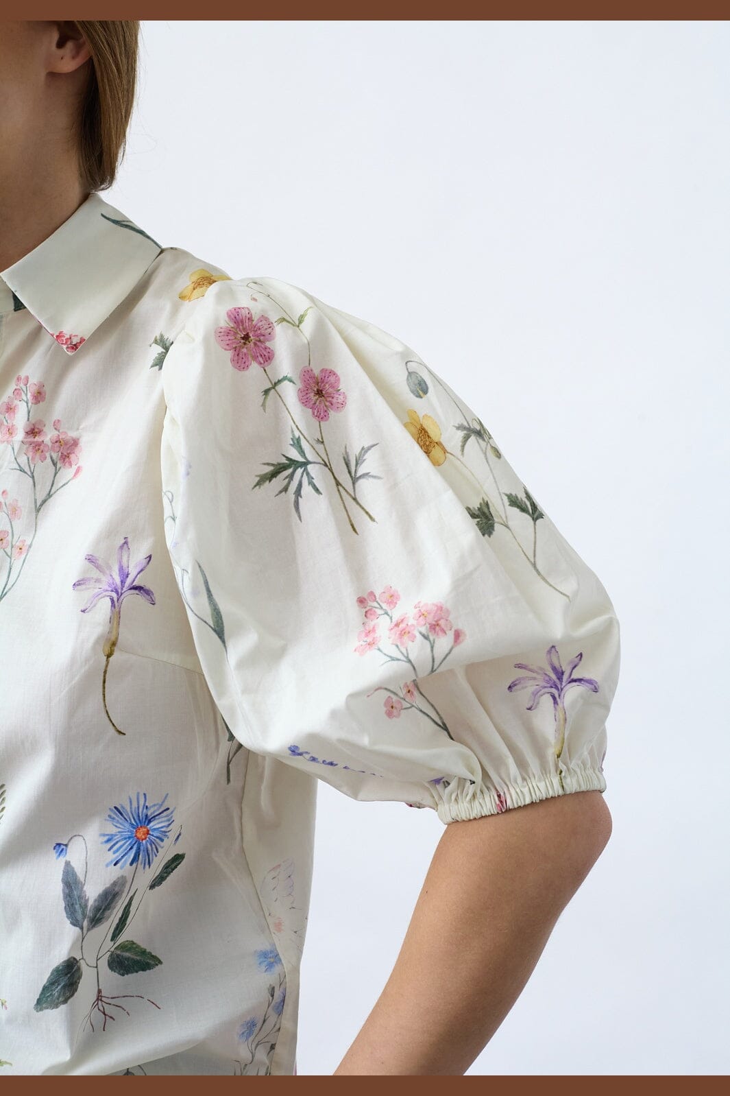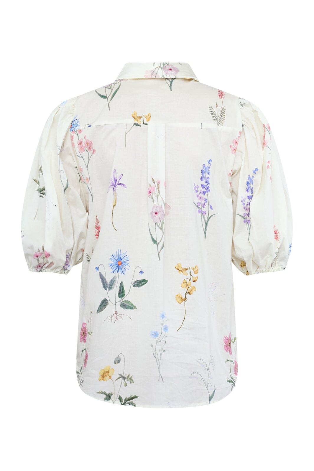 Skjorte fra Sisters Point i en lys creme-nuance med et flerfarvet blomstermønster. Skjorten har korte pufærmer og en klassisk skjortekrave med knaplukning.