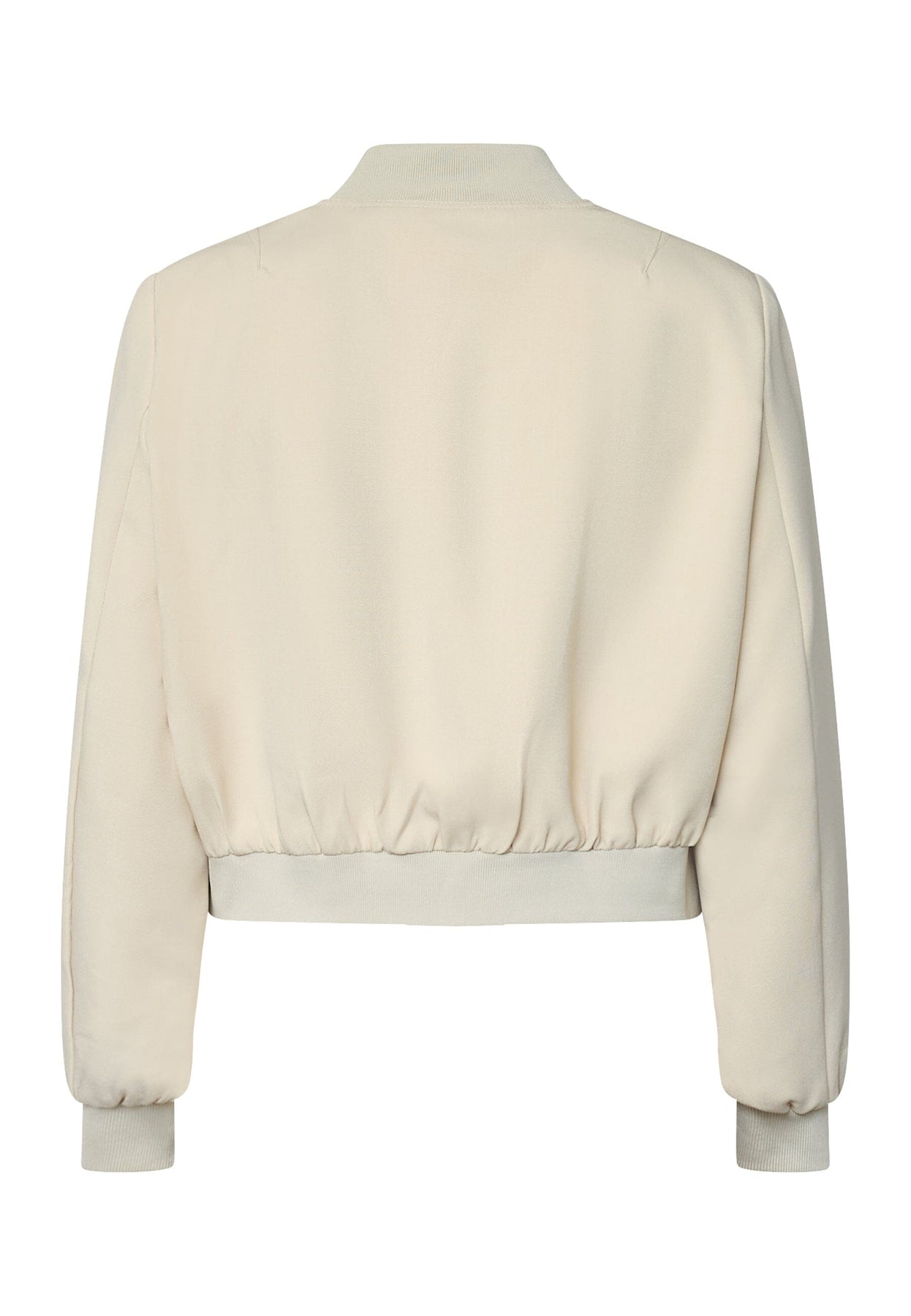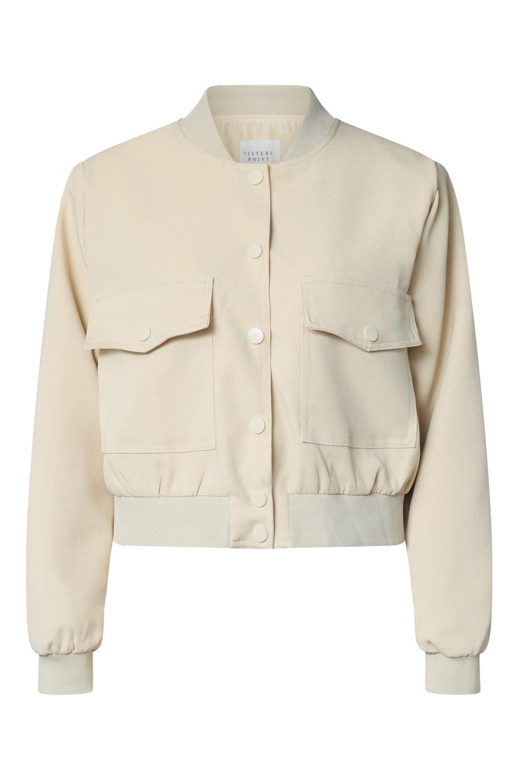 Kort jakke fra Sisters Point i en lys beige farve. Jakken har en rund hals med elastikkant og lange ærmer med brede ribstrikmanchetter.