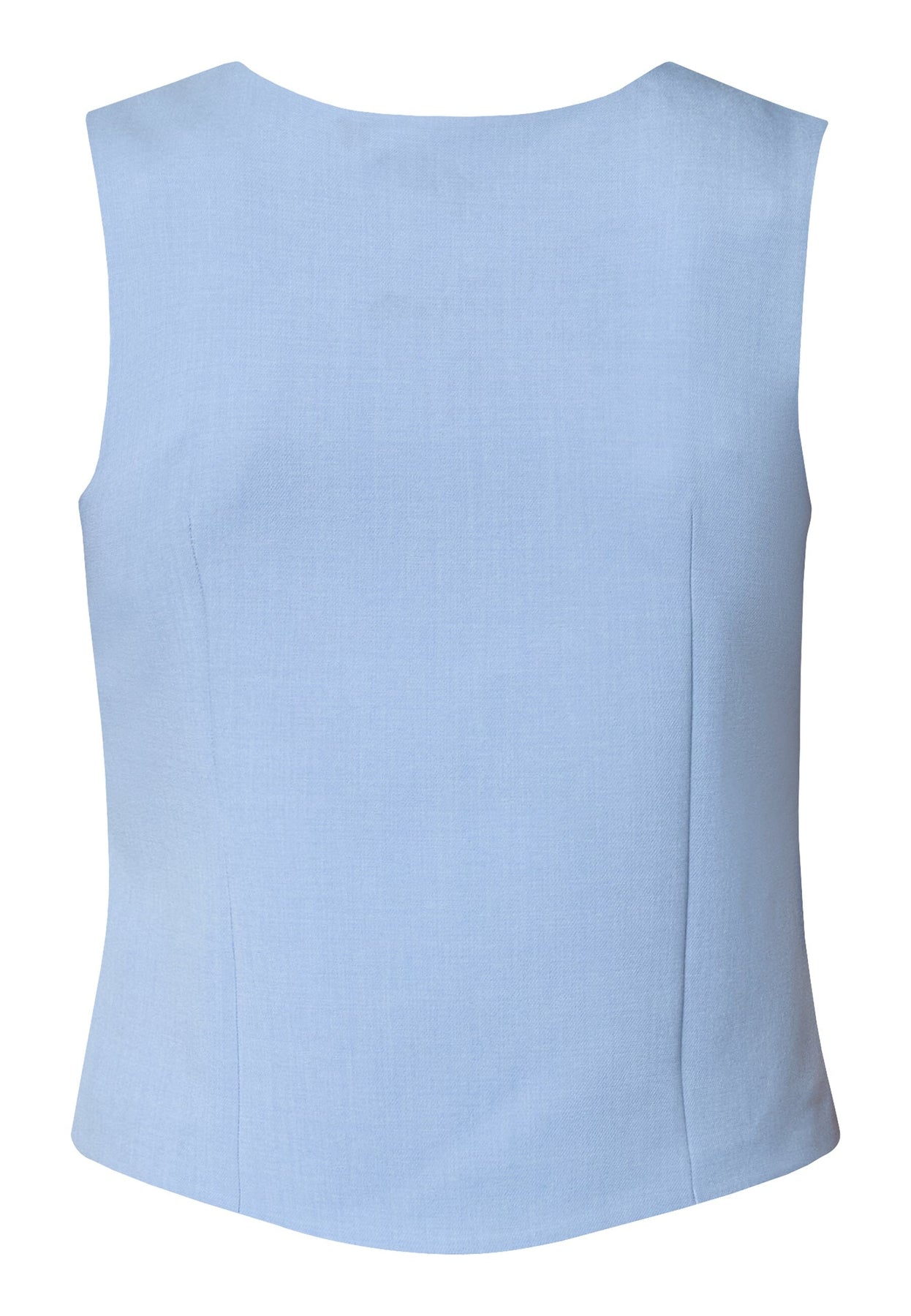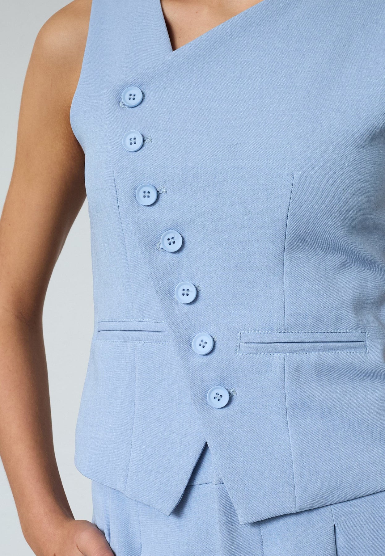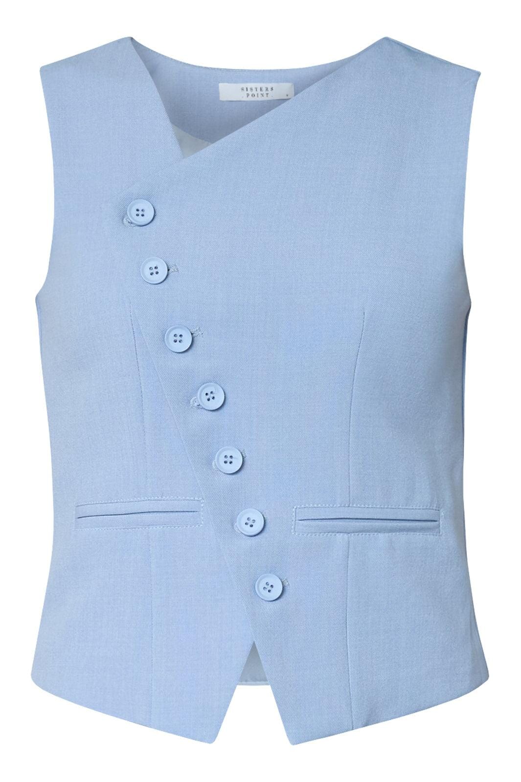 En lyseblå vest fra Sisters Point med asymmetrisk knaplukning og V-hals. Vesten har seks knapper ned langs fronten og to dekorative lommer.