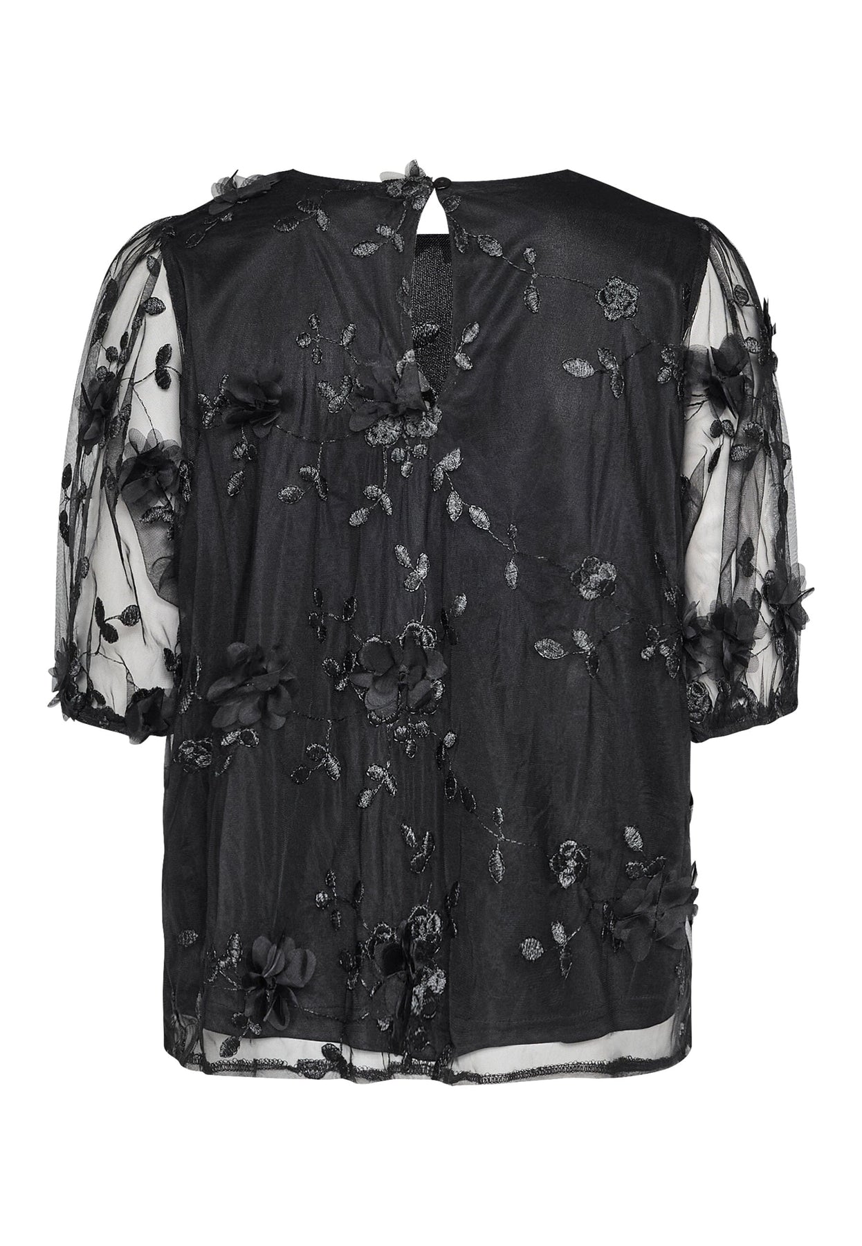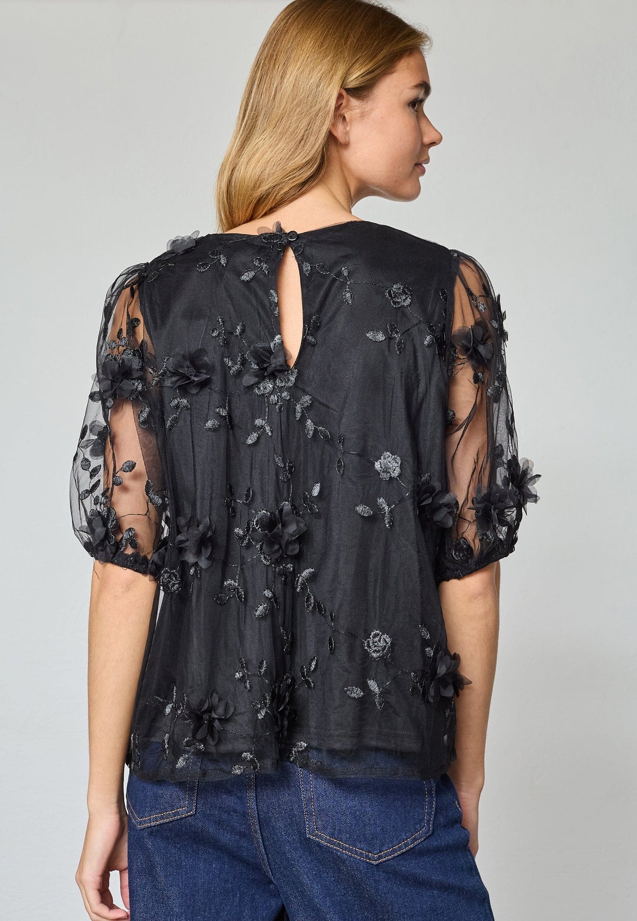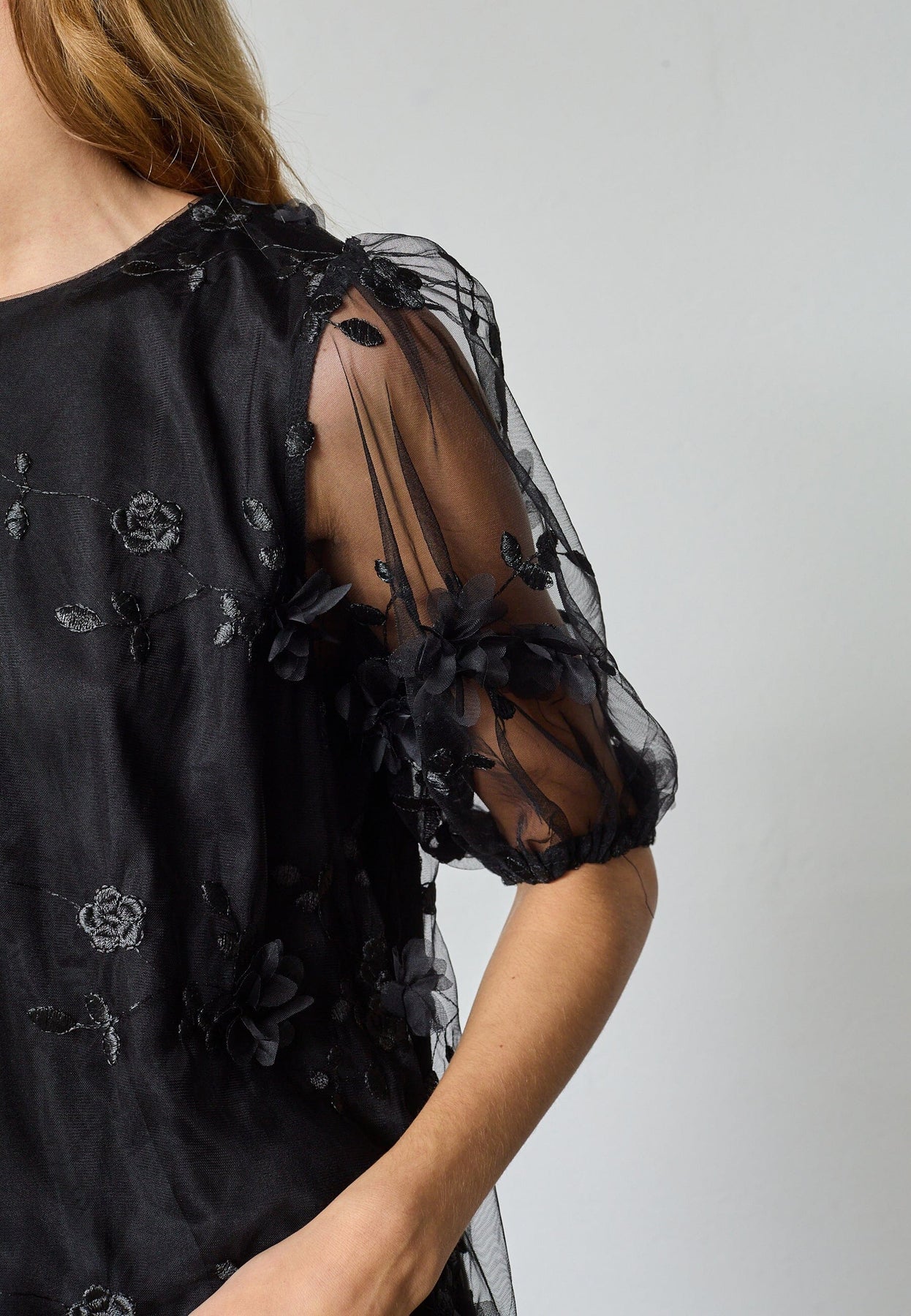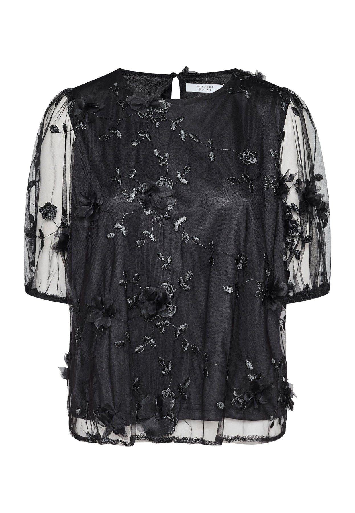 Sort bluse fra Sisters Point, lavet af gennemsigtigt stof med blomsterbroderier over hele overfladen. Blusen har korte, løstsiddende ærmer og en rund hals.