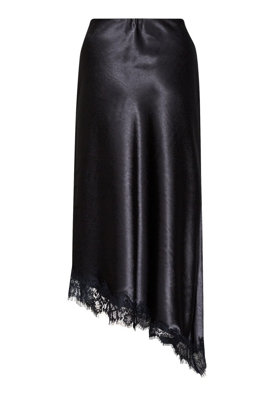 Sort nederdel fra Sisters Point med et skinnende satinlook i vævet polyester. Nederdelen har et asymmetrisk snit med en skrå kant prydet med blonde.