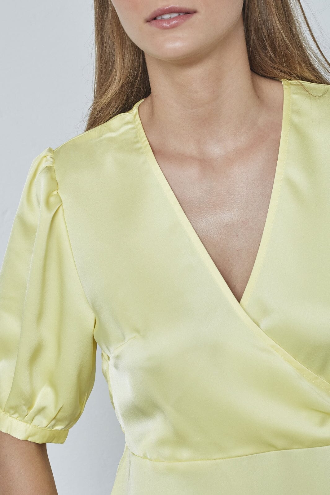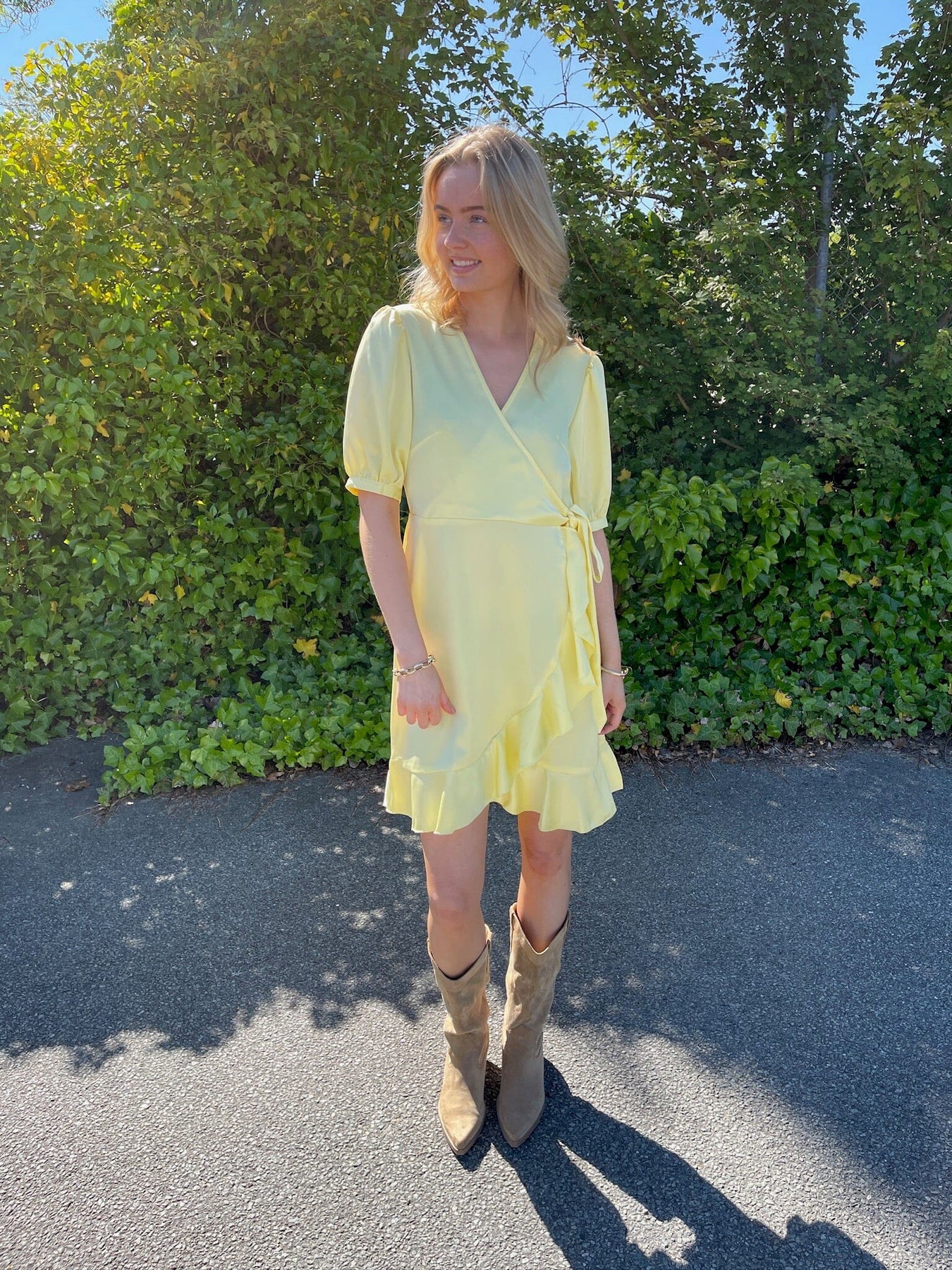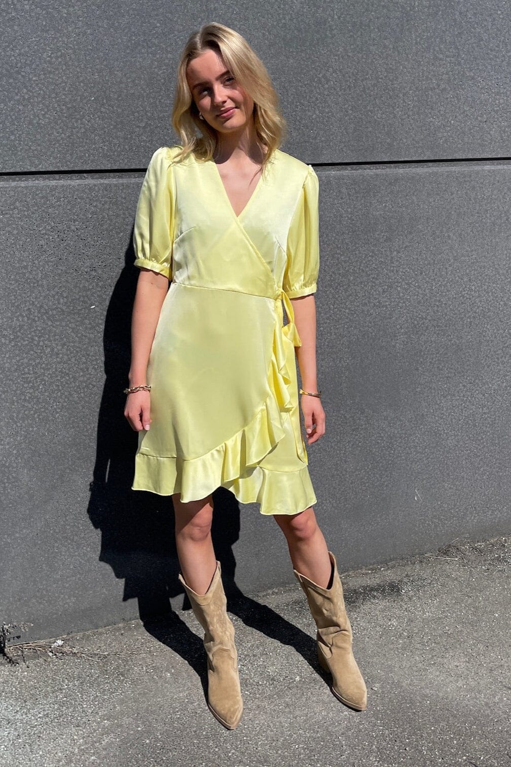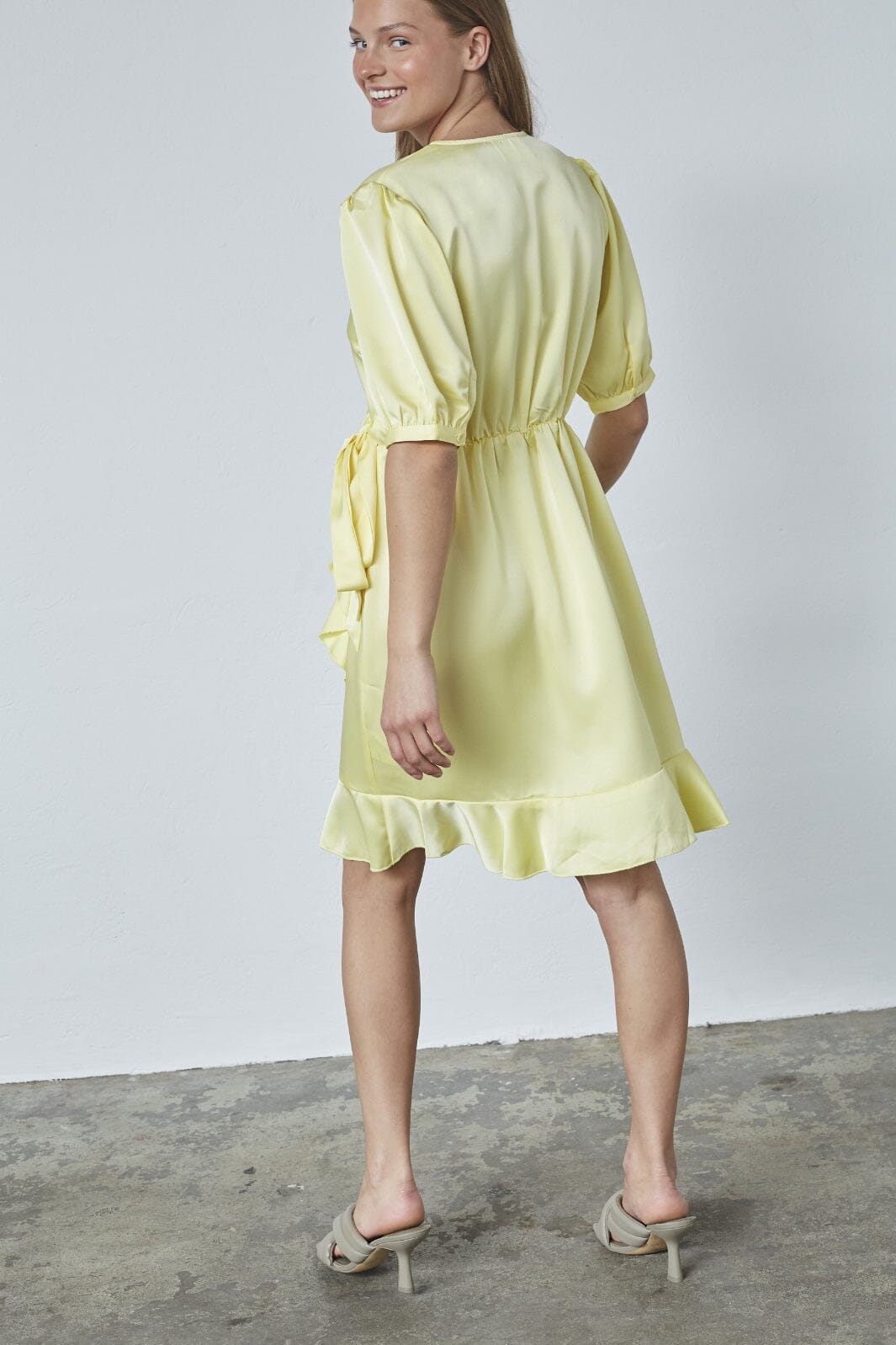 Slå-om-kjole fra Sisters Point i lys gul satin. Kjolen har puffede ærmer, v-hals og en flæsekant forneden. Et bindebånd i siden skaber en fin silhuet.