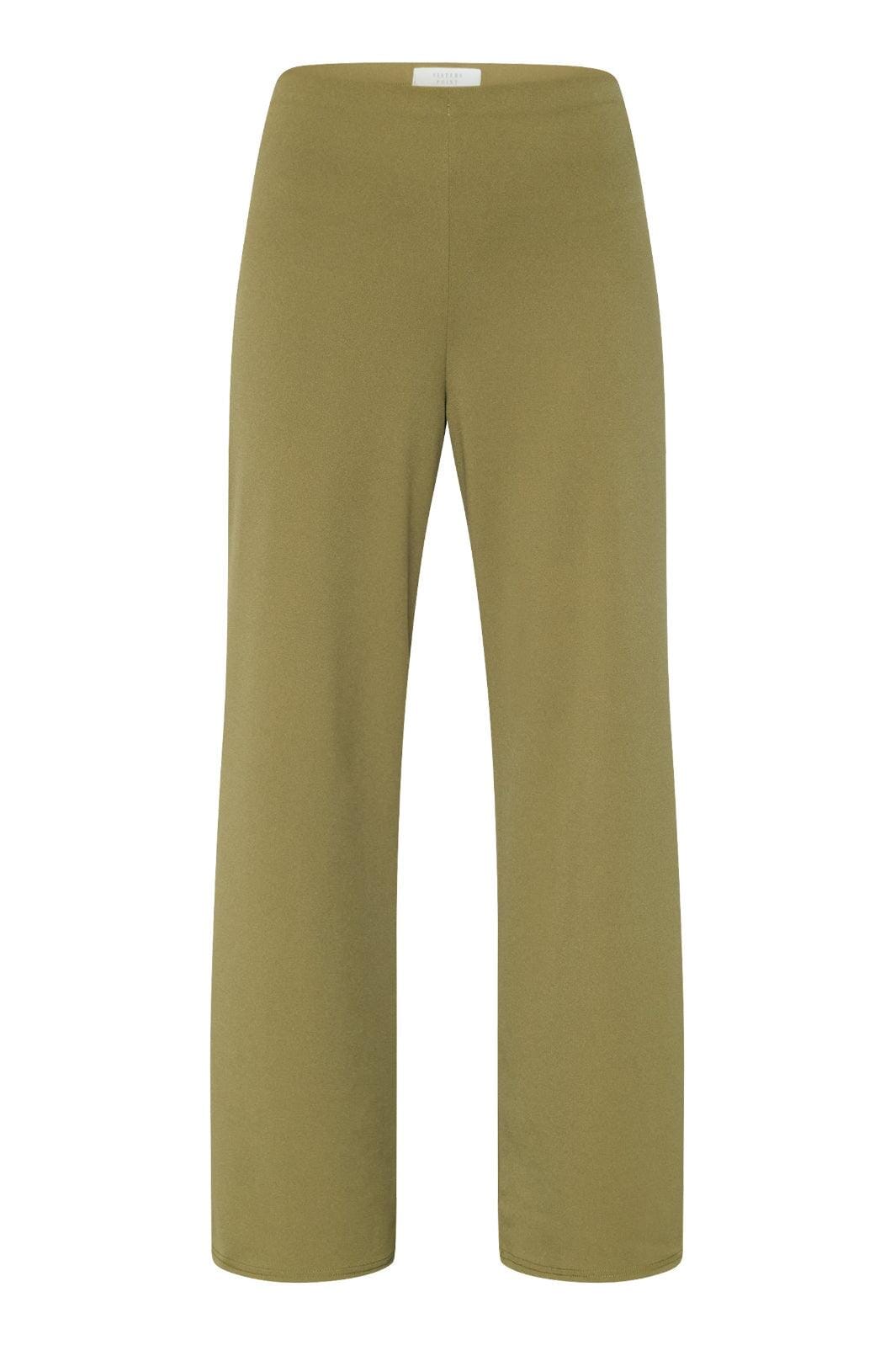 Bukser fra Sisters Point i olivengrøn med brede ben og en løs pasform. Den høje talje og det ensfarvede design giver bukserne en moderne stil.