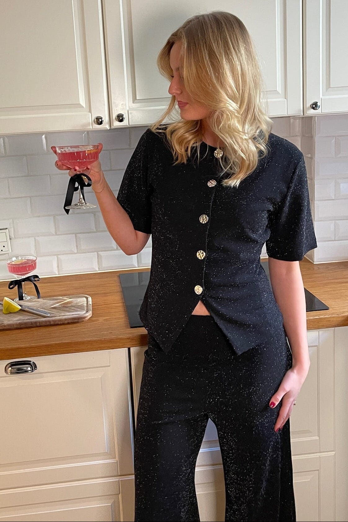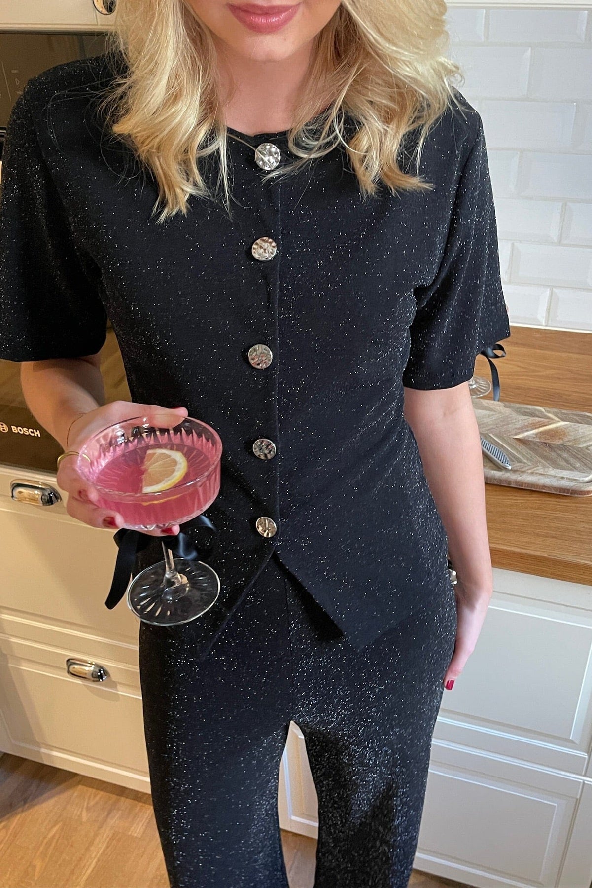 Sort top med glitrende sølveffekt fra Sisters Point. Toppen har en rund halsudskæring og korte ærmer med dekorative sølvknapper på forsiden.