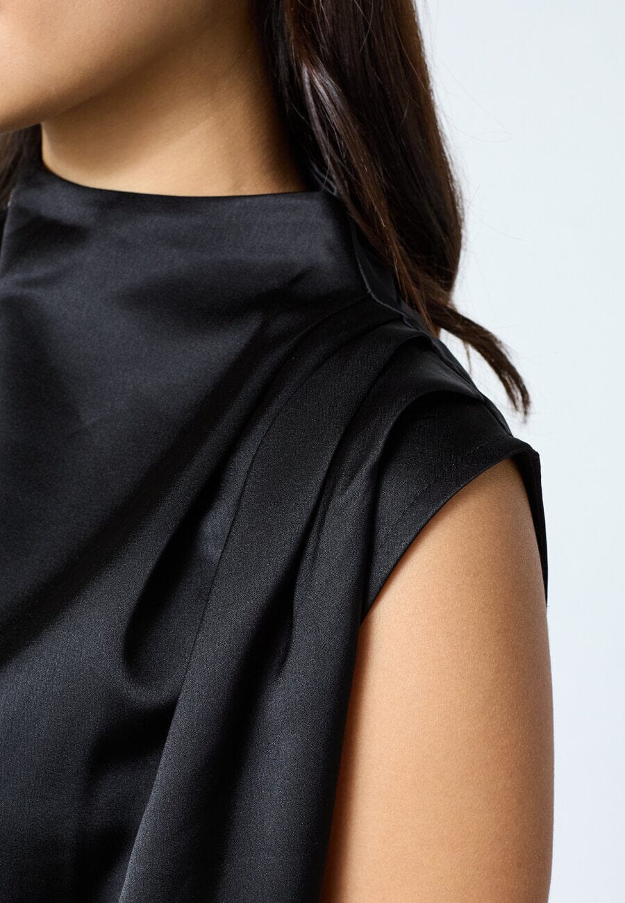 Sort ærmeløs bluse fra Sisters Point med et skinnende satinlook. Materialet er 100% polyester med en glat overflade.
